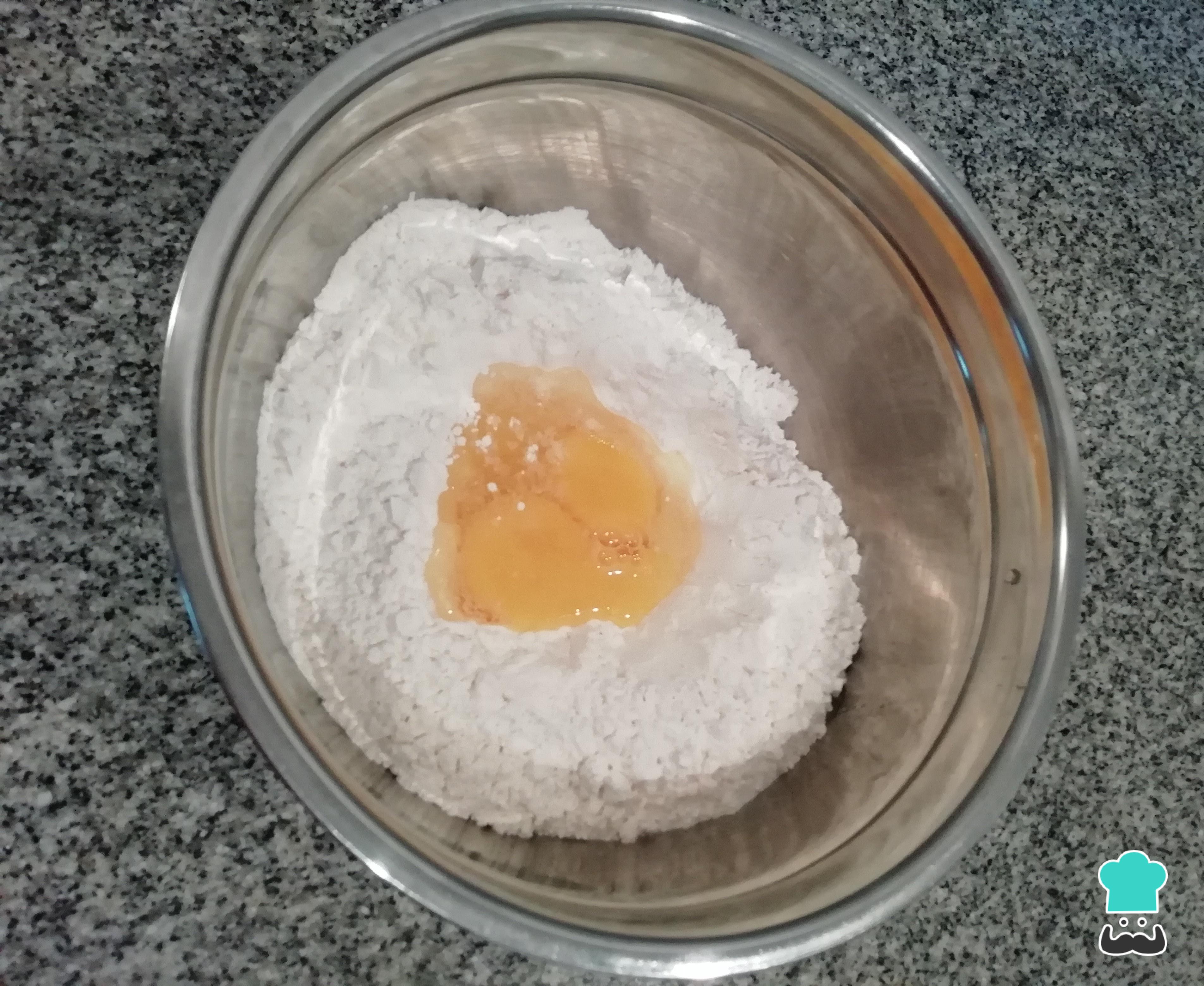 Luego, ponemos la harina en un bol y le hacemos un hoyo en el centro.