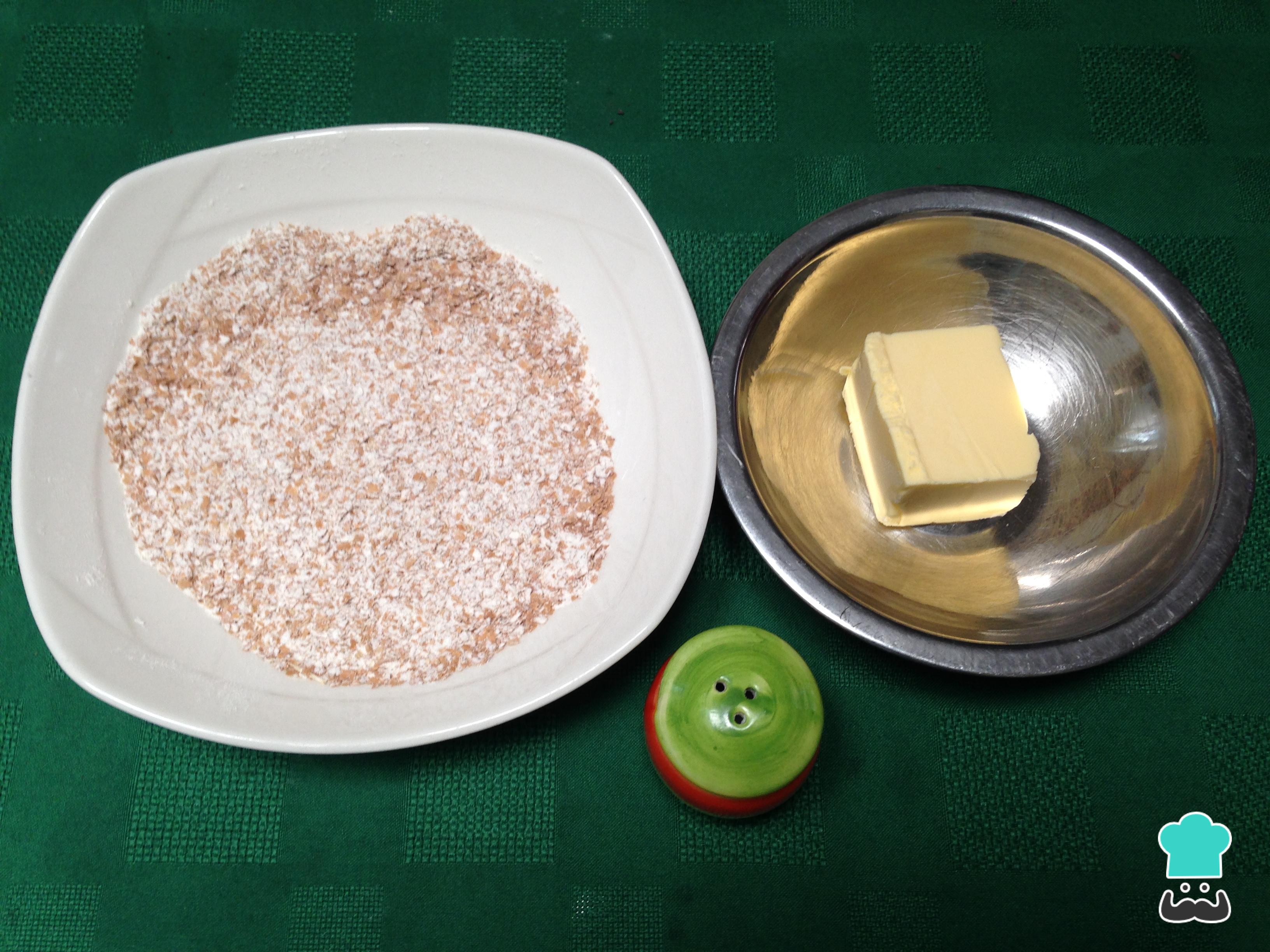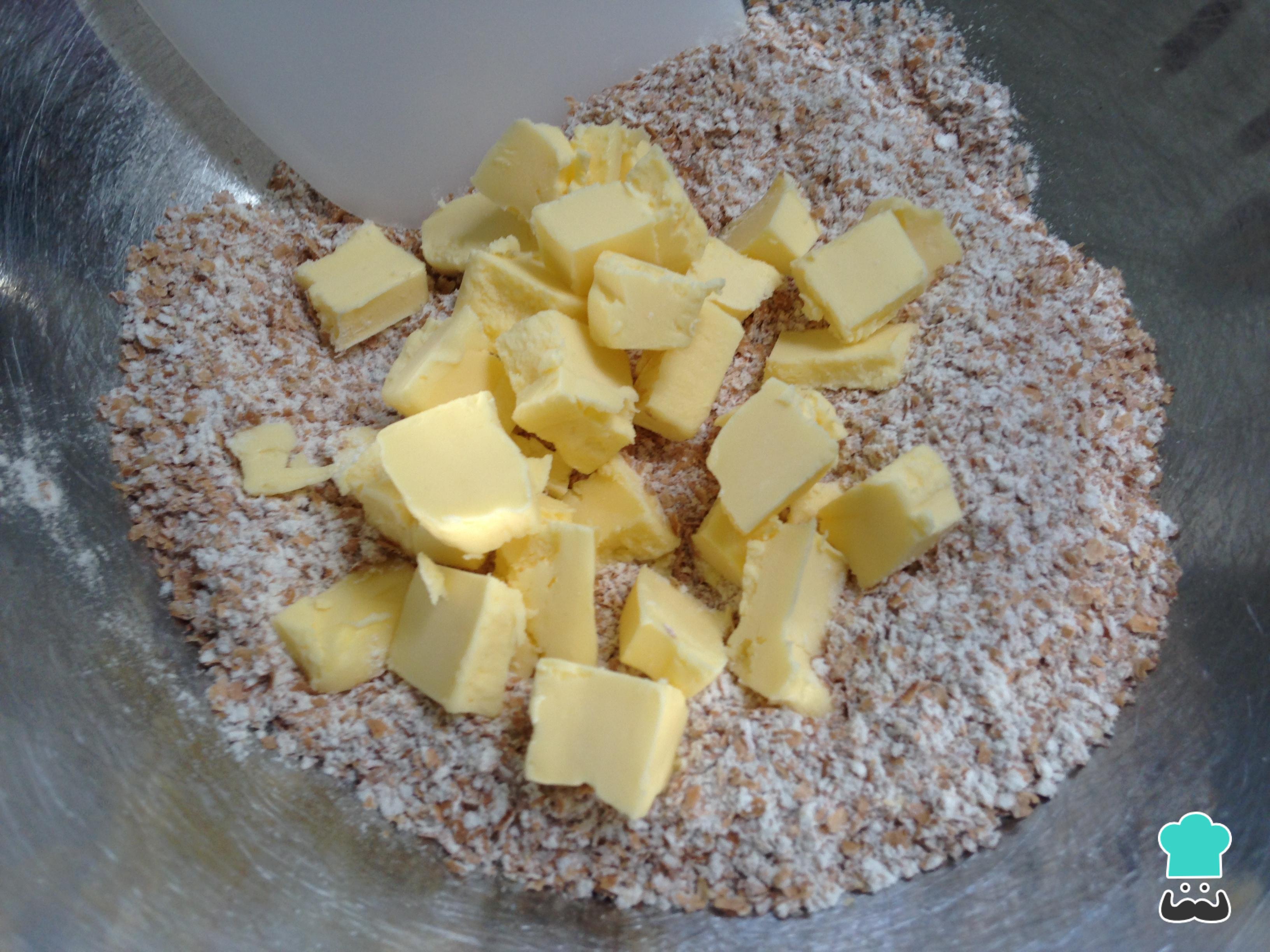 Colocar la mantequilla sobre la harina integral sin gluten, esta harina la puedes conseguir en tiendas naturistas. Luego, picar con un cuchillo hasta obtener una arena, de esta forma también evitamos desarrollar el gluten por si no pueden conseguir la harina sin gluten.