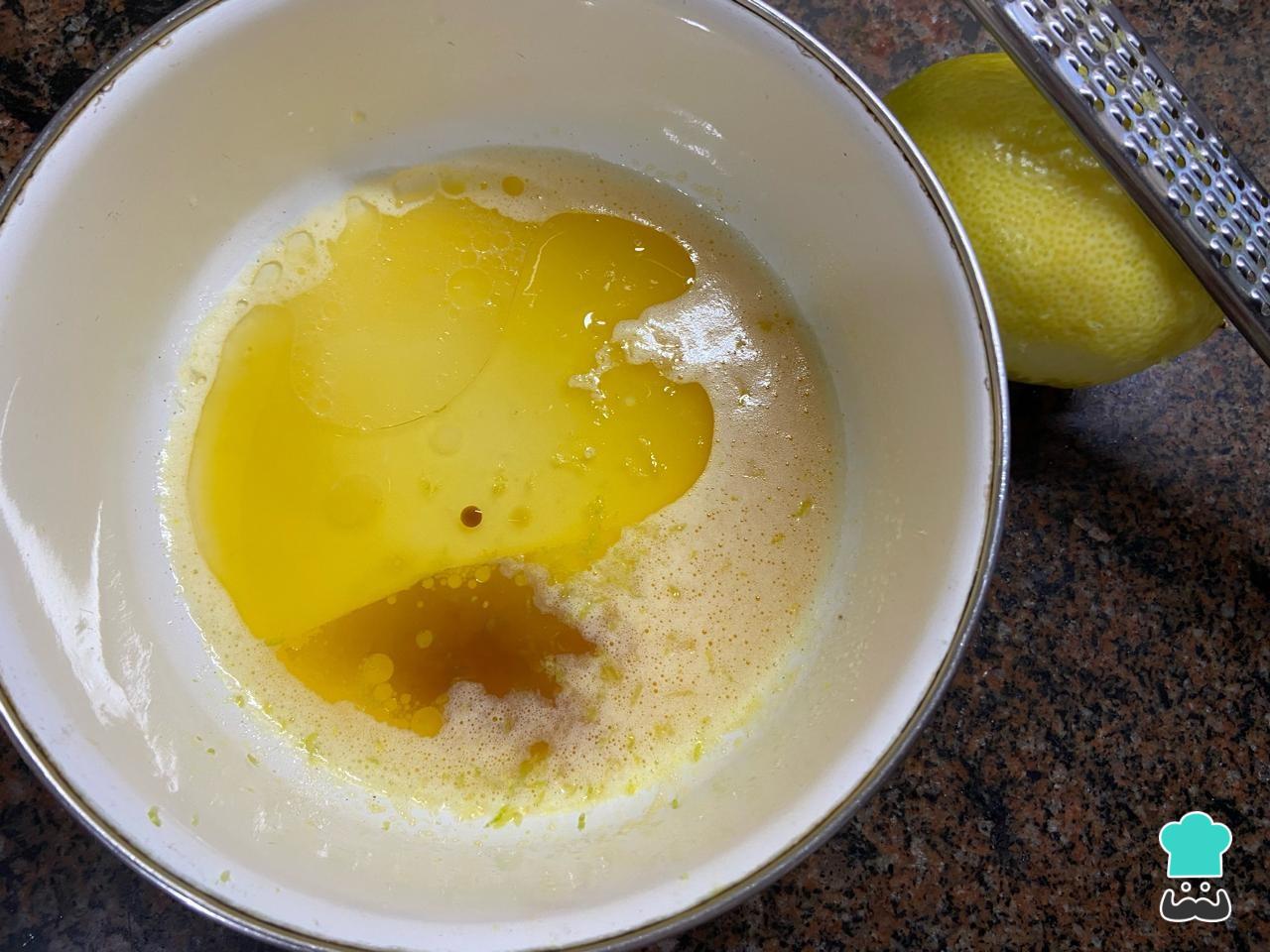 Agrega el aceite, la esencia de vainilla y la ralladura y el jugo de limón, continúa batiendo para integrar.