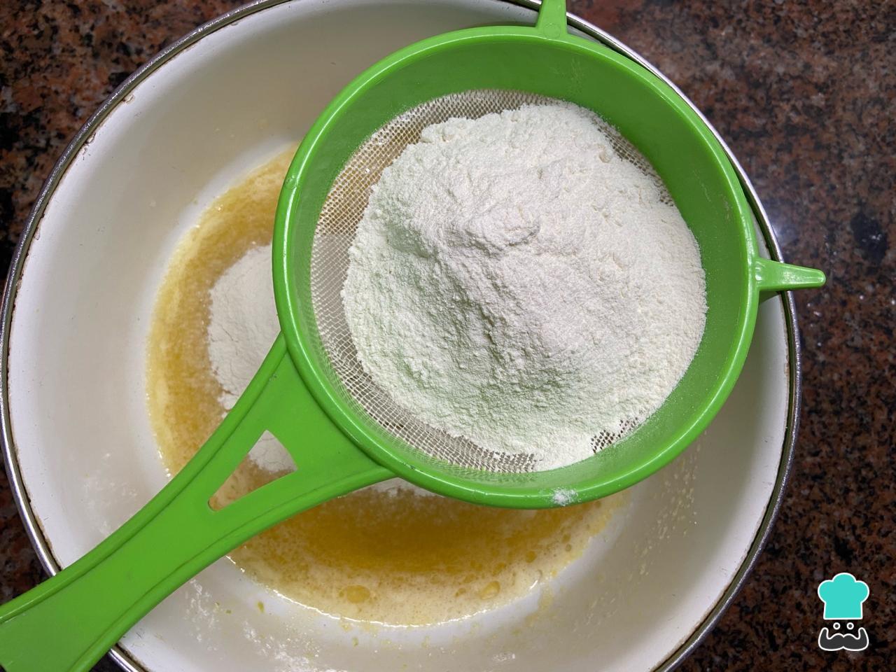Añade la harina tamizada e incorpora con una espátula o cuchara.