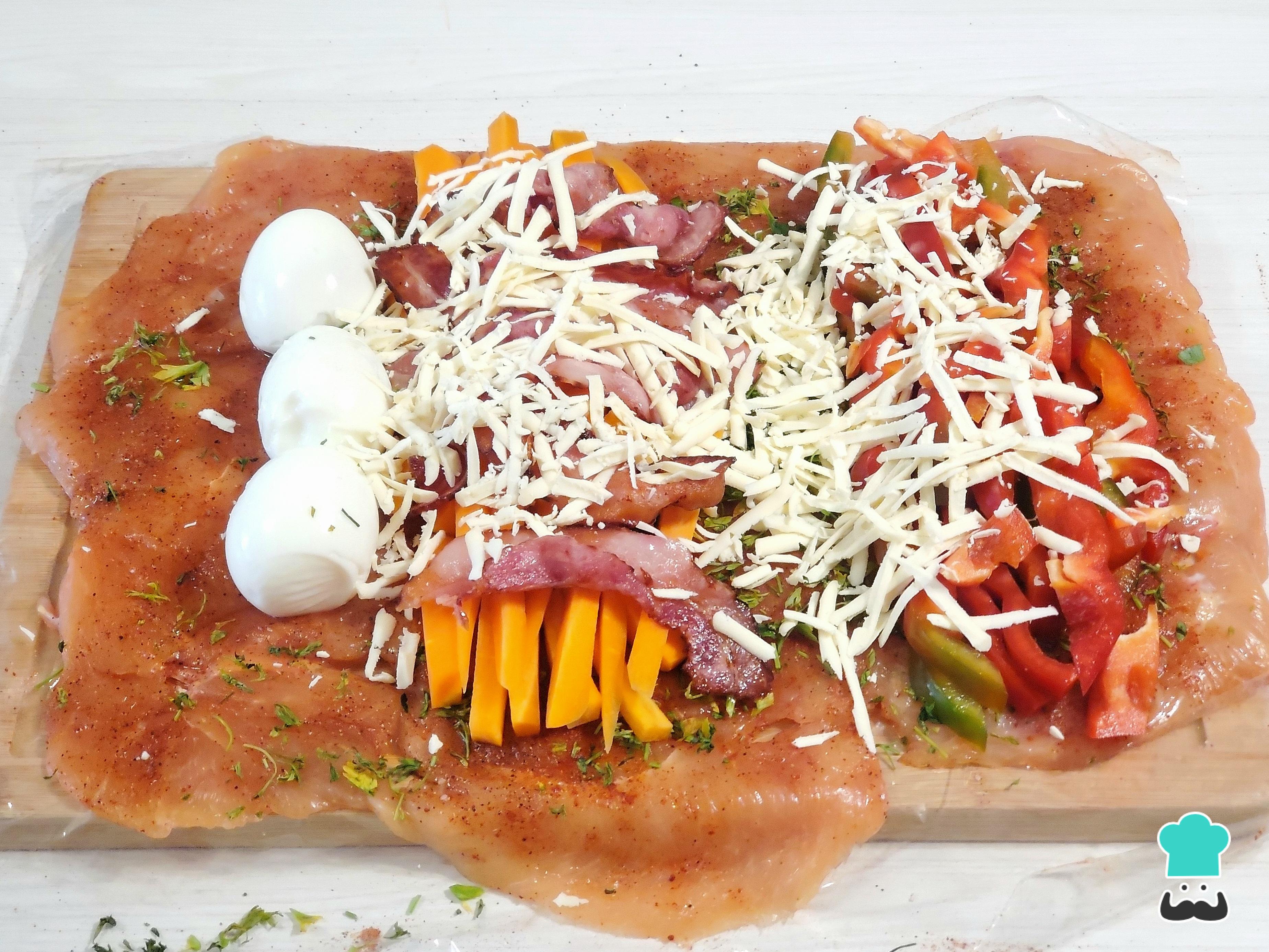 Una vez listas las pechugas, coloca los ingredientes del relleno. La versión más tradicional lleva huevos sancochados dispuestos en fila en un extremo, de modo que al cortar se aprecie la yema entera.