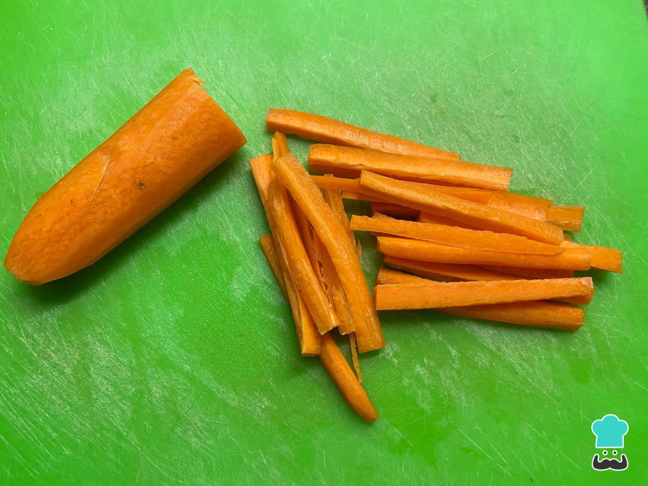 Lava y pela la zanahoria. Luego, corta en tiras no muy gruesas.