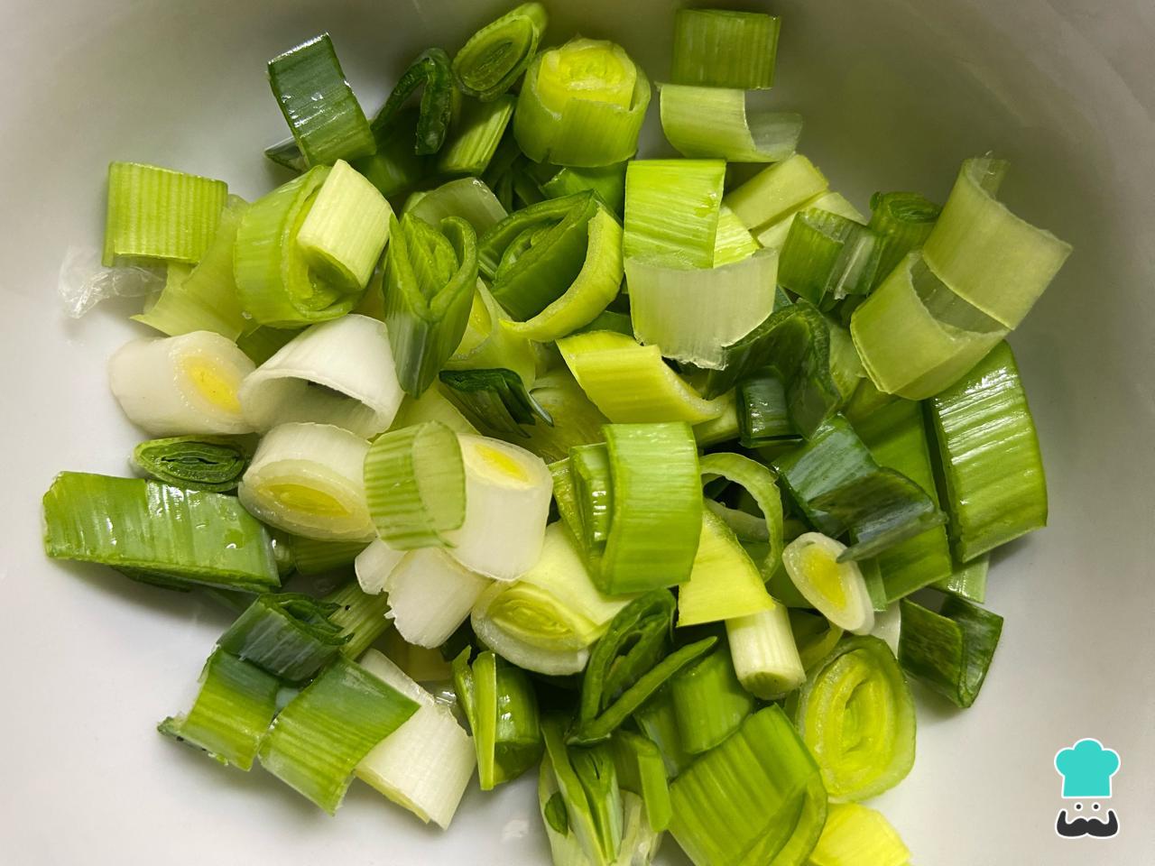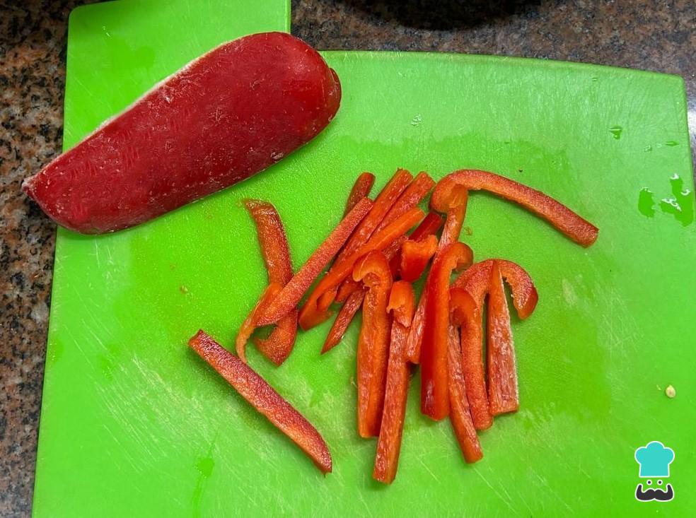 Después de lavar el pimiento, retira las semillas y nervaduras, corta en tiras.