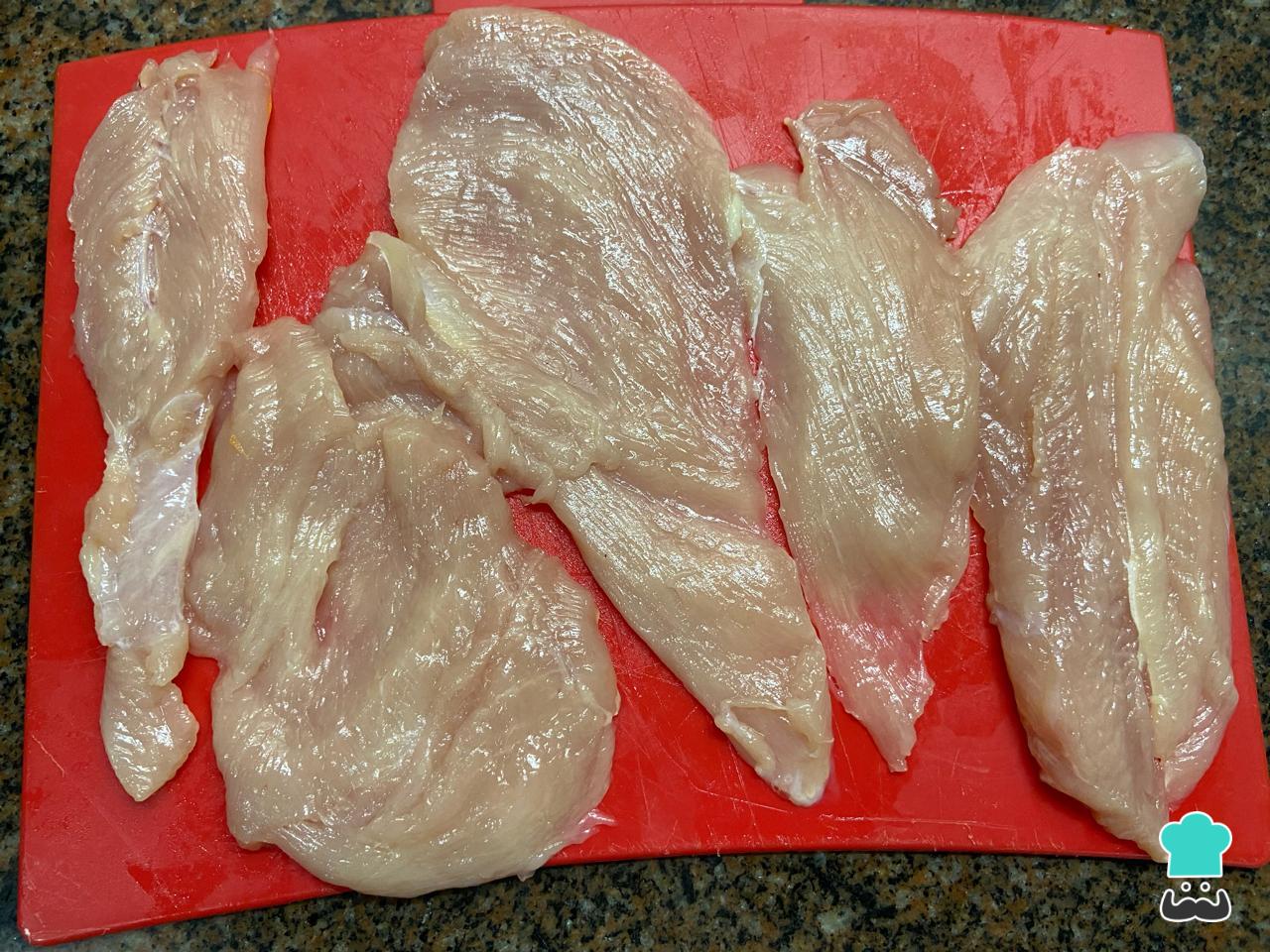 Limpia las pechugas de pollo retirando grasa, membranas o cartílagos que puedan tener. Luego, córtalas en filetes.