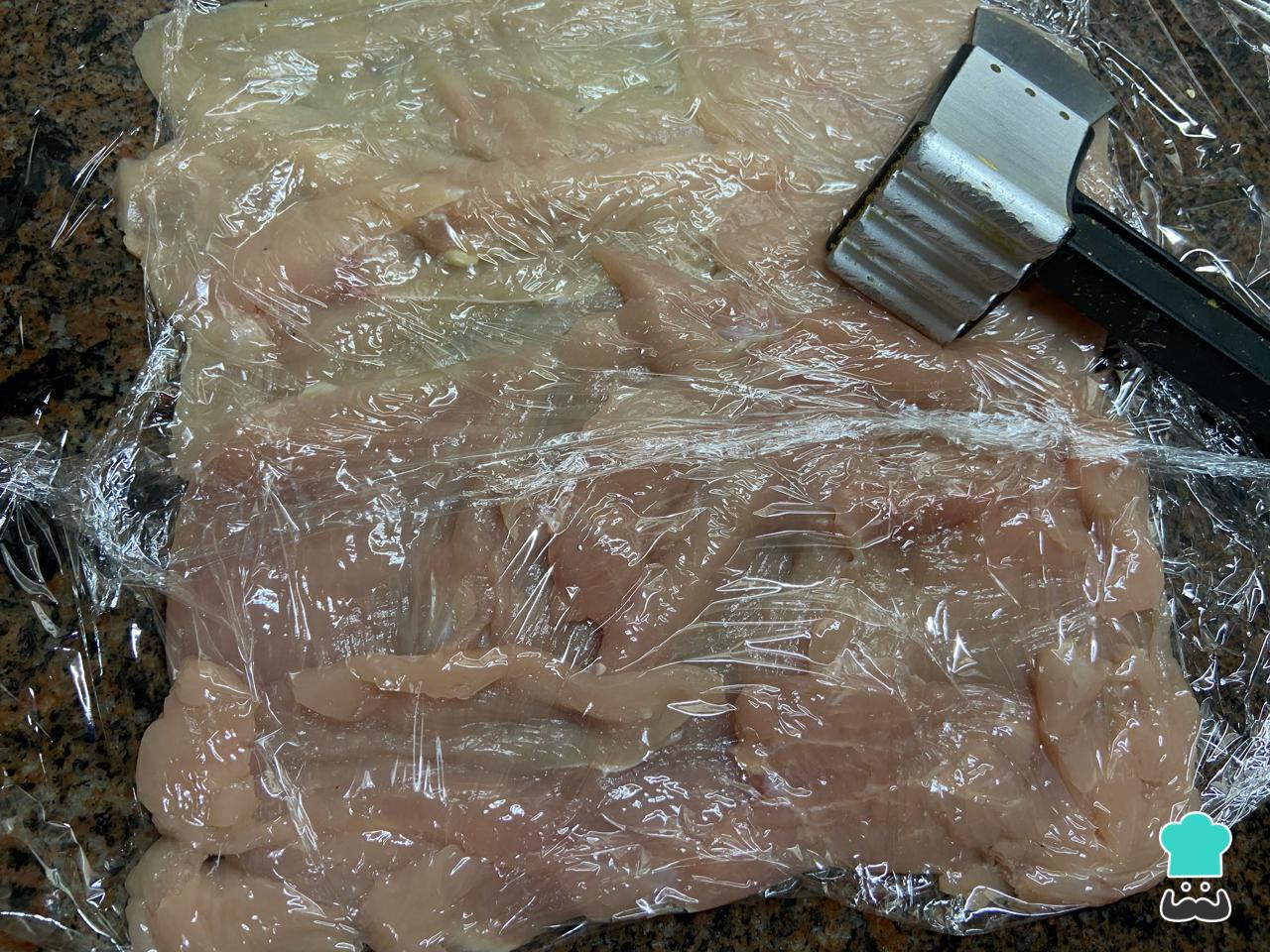 Extiende film transparente sobre la mesada y distribuye allí los filetes de pollo añadiendo unos con otros. Asegúrate de que no queden agujeros. Luego, cubre con otro film y, con la ayuda de un palote o un martillo de cocina, machaca para ayudar a que se adhieran los filetes entre sí y para unificar la altura de los mismos.