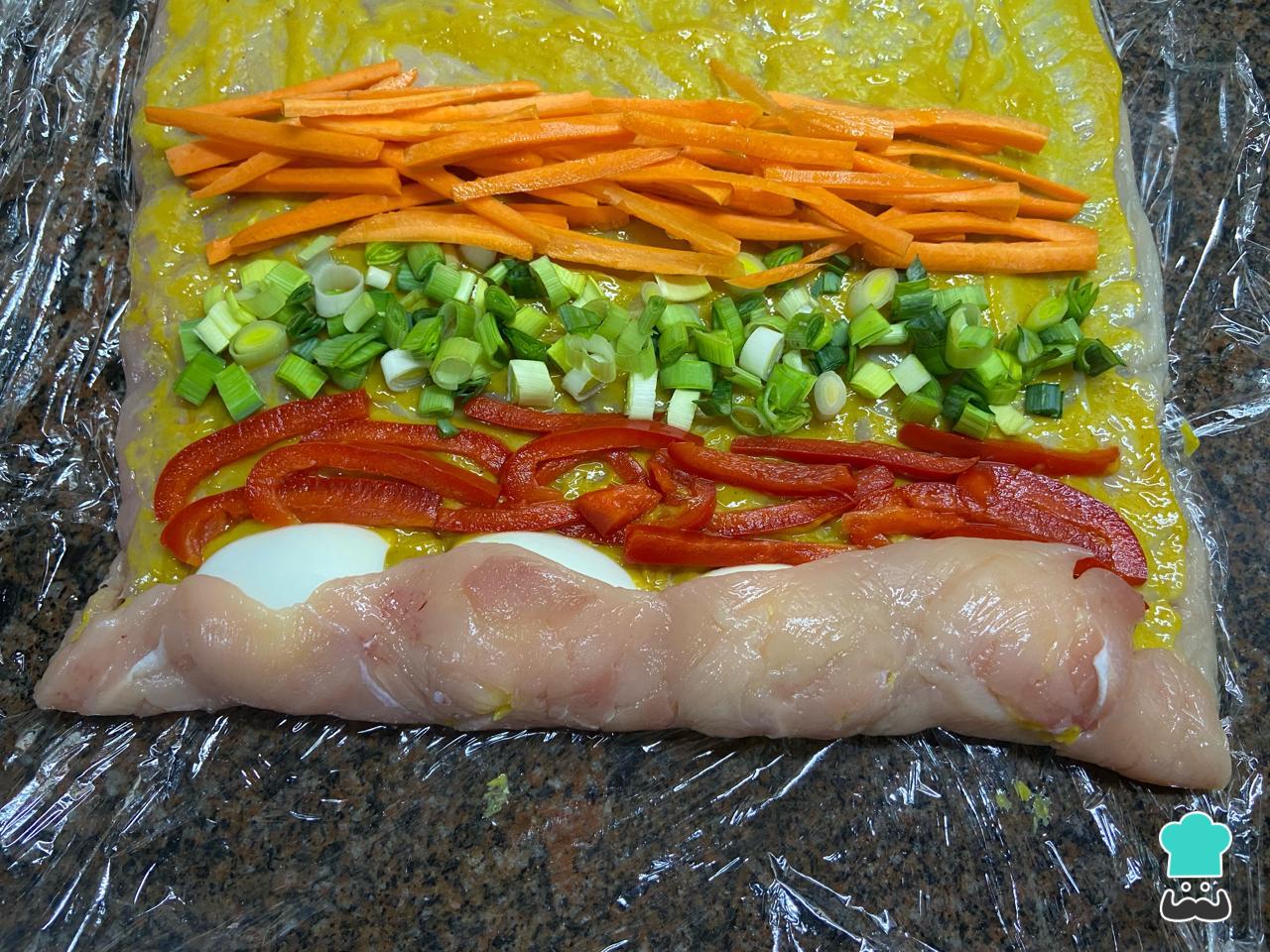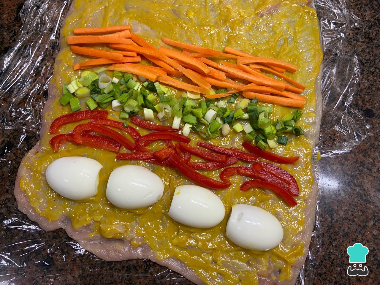 Retira el papel film superior y salpimienta y unta la superficie con la mostaza. Luego, realiza franjas con la zanahoria, el puerro, el pimiento y los huevos duros pelados y cortados a la mitad.