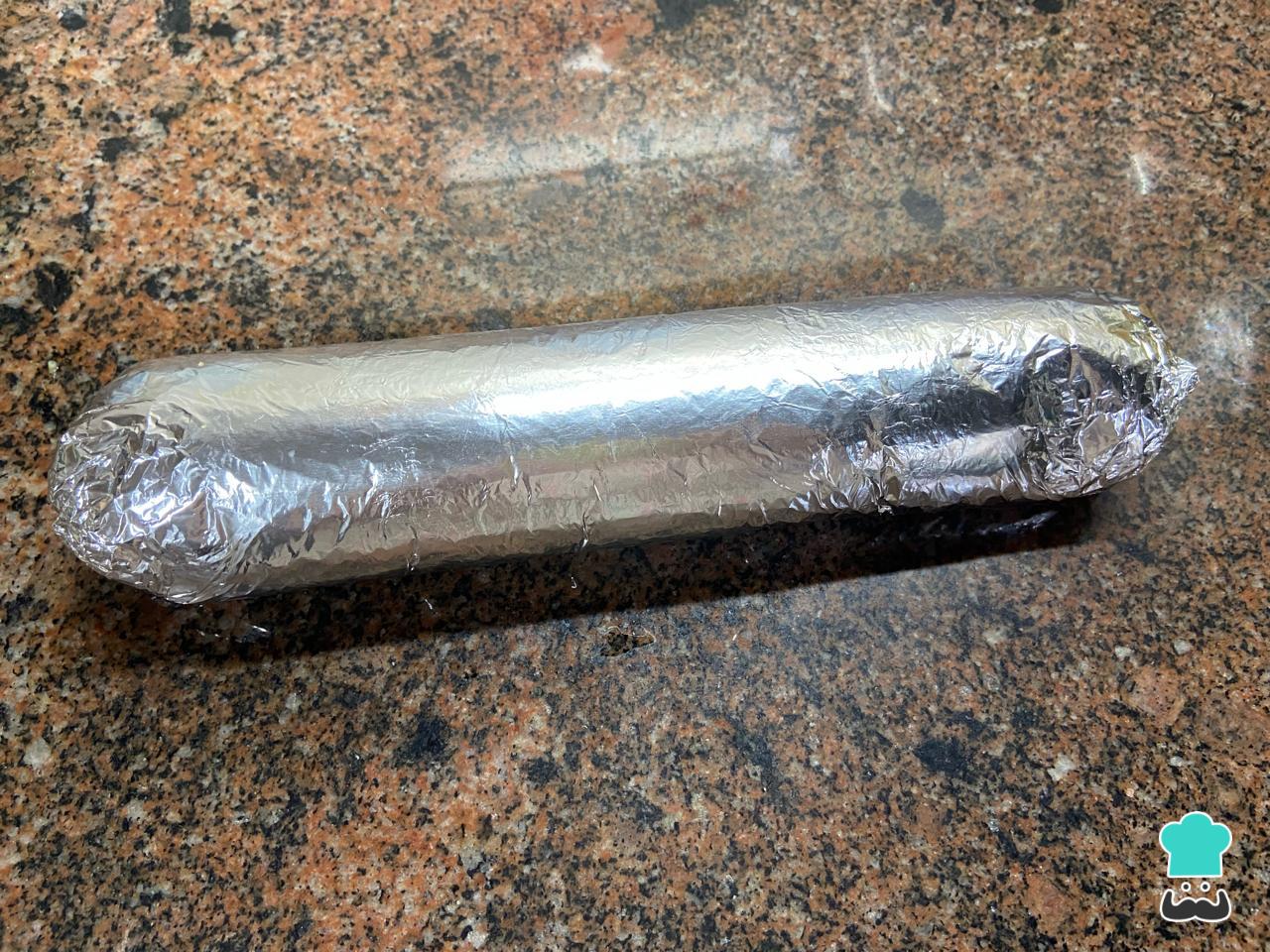 Ayúdate con el film de la base para enrollar. Comienza del lado donde están los huevos y ajusta bien con las manos en cada vuelta.