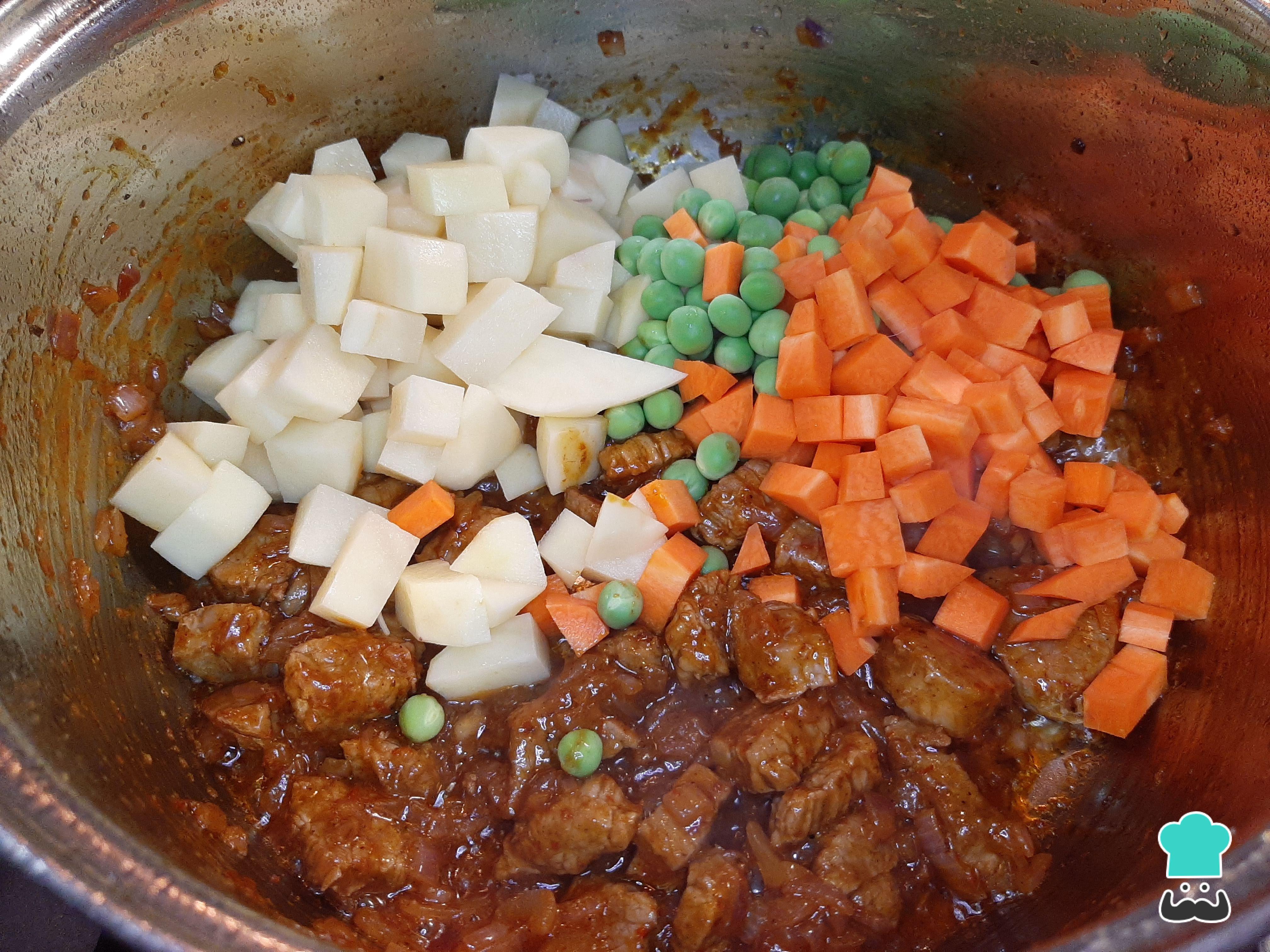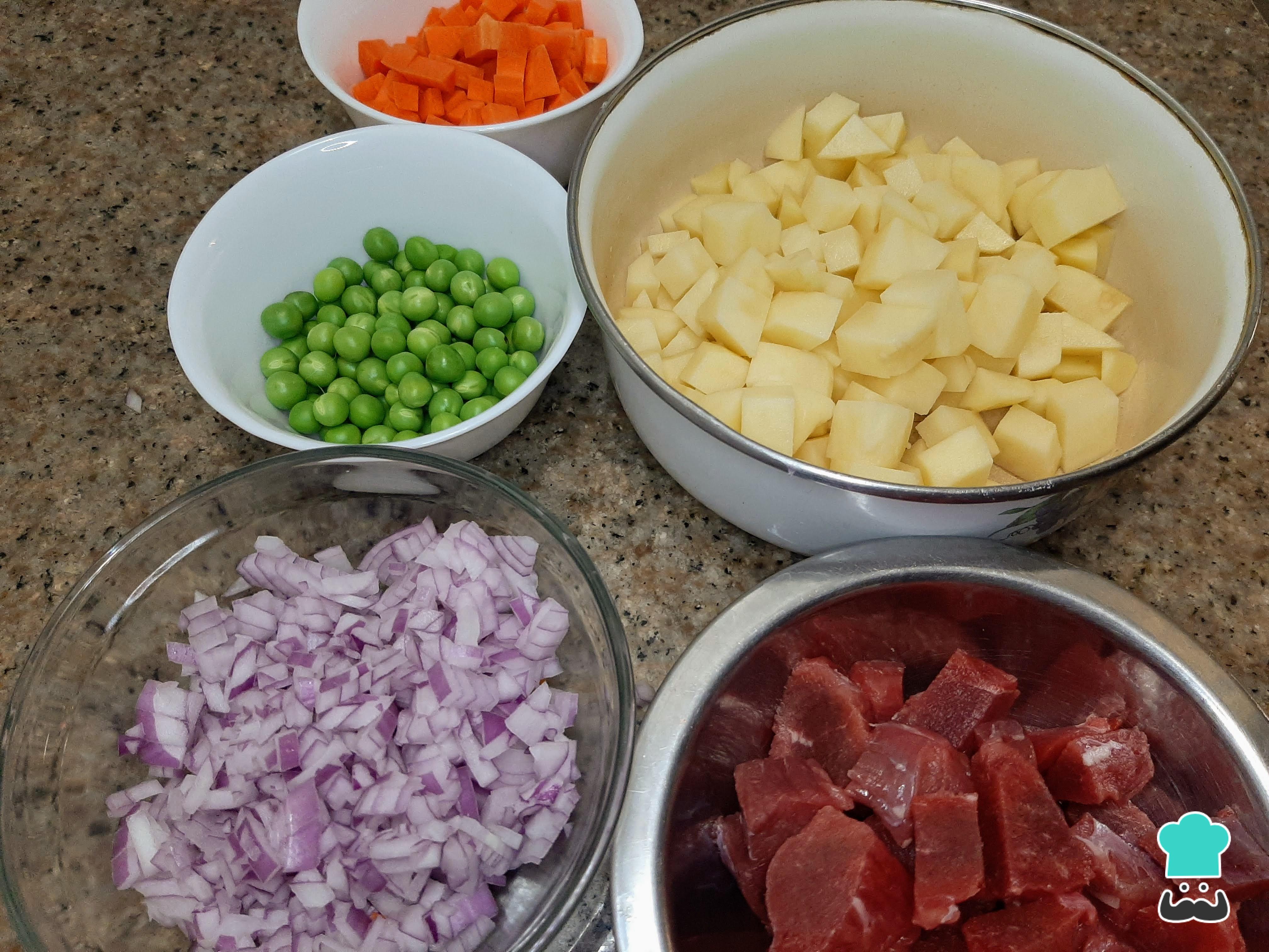 Para empezar con la receta de matasquita de carne, primero debes cortar la carne del guiso en cuadrados medianos. La cebolla morada en cuadrados pequeños, pelar y cortar las papas en cuadrados medianos, y lo mismo con la zanahoria.