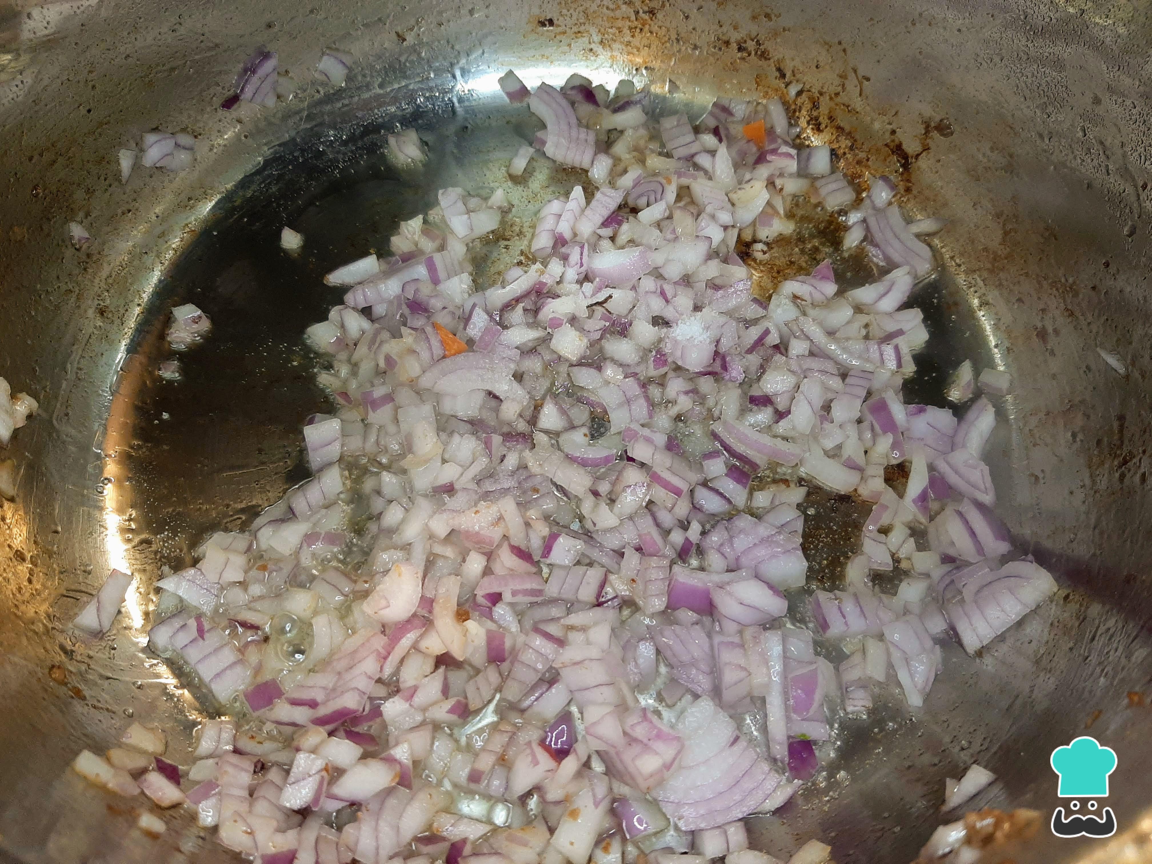 En una olla mediana, agrega un chorro de aceite y añade la cebolla morada en cuadrados.