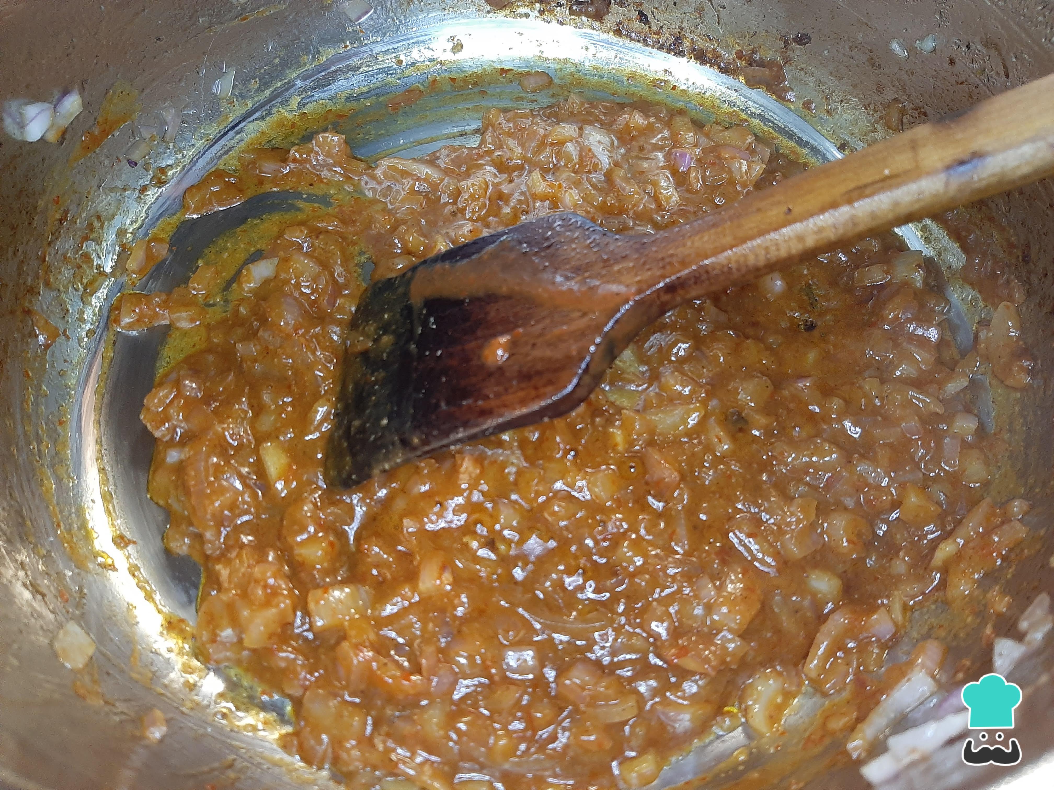 Cuando la cebolla se encuentre transparente, incorpora la pasta de ají panca y el ajo molido.