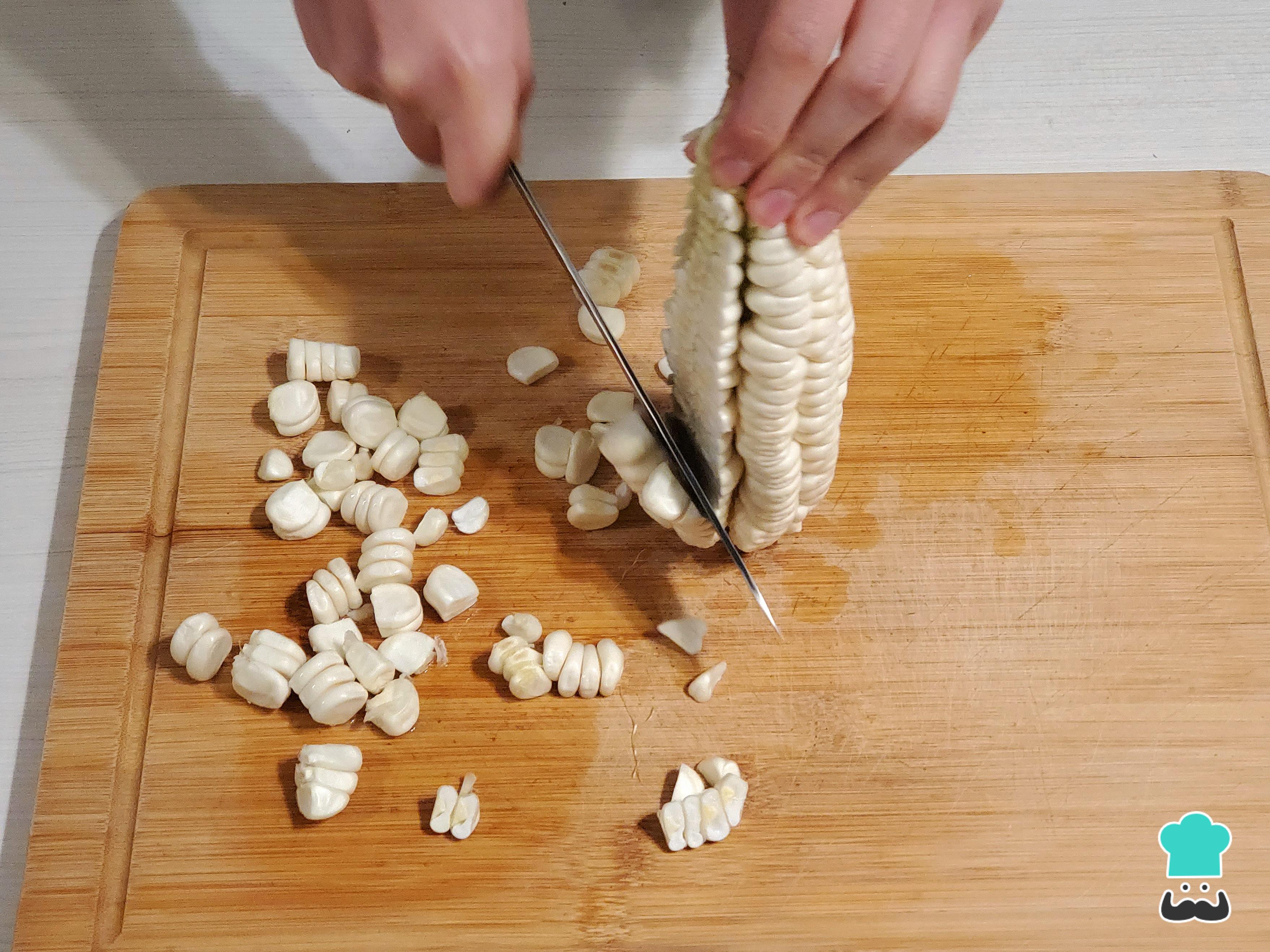 Empieza desgranando el choclo o la mazorca de maíz. Para esta receta, lo más tradicional es usar la variedad amarilla de granos pequeños y con sabor más dulce. Para desgranar, coloca una mazorca de forma vertical y, con un cuchillo, comienza a cortar una a una las filas de granos de arriba hacia abajo. Luego, ve rotando la mazorca hasta desgranarla por completo.