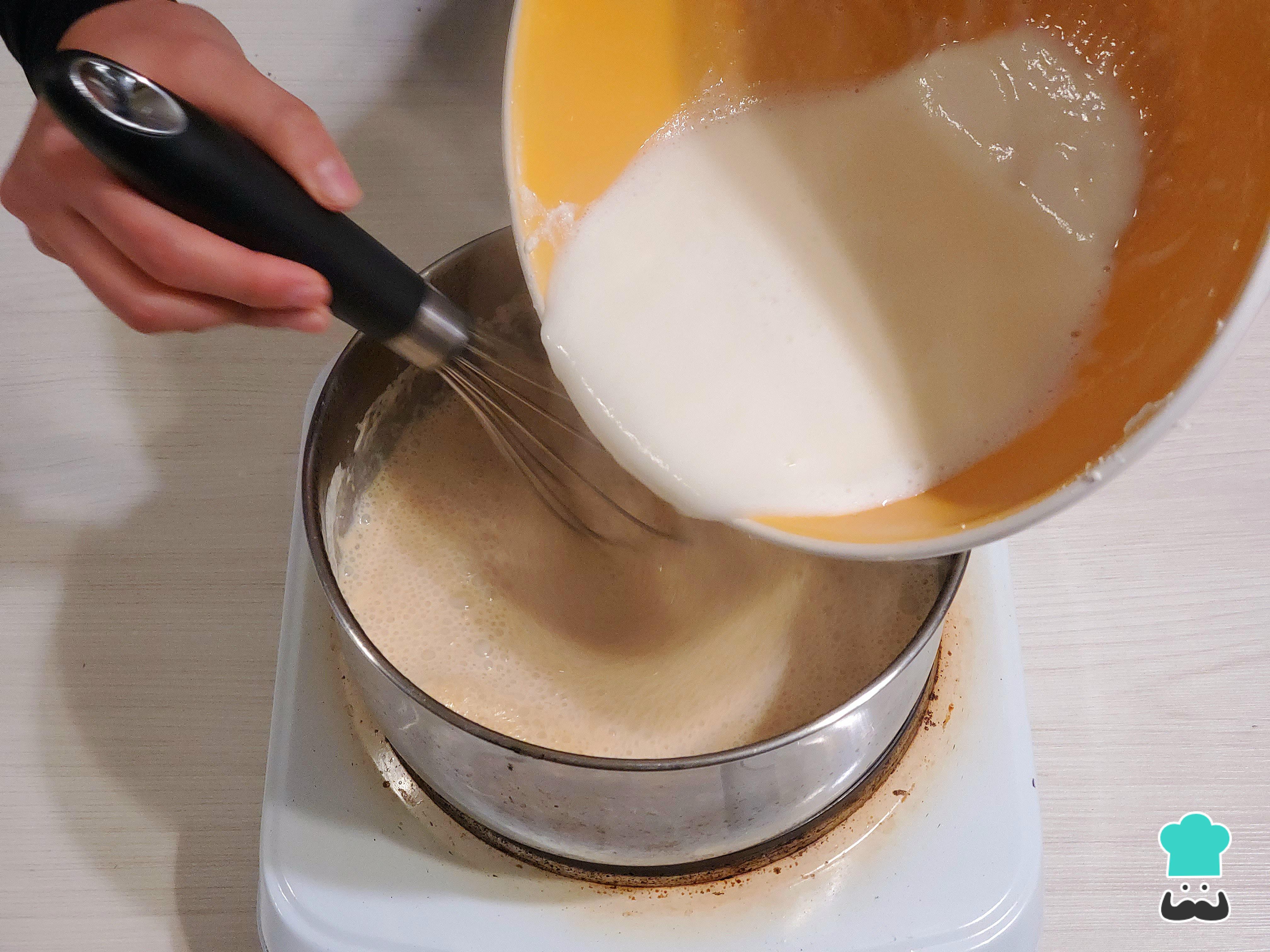 Incorpora la mezcla de choclo a la leche y, mientras lo haces, remueve con un batidor de globo para evitar que se formen grumos.