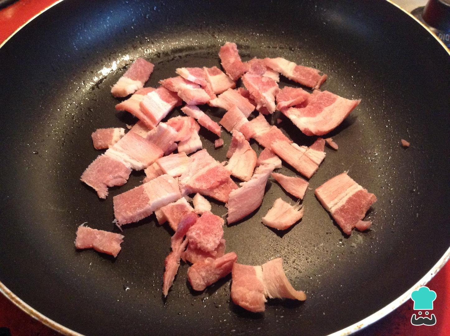 Lleva una sartén a fuego medio y adiciona la tocineta. Cocina hasta que se dore muy bien o hasta que este al punto que prefieras.