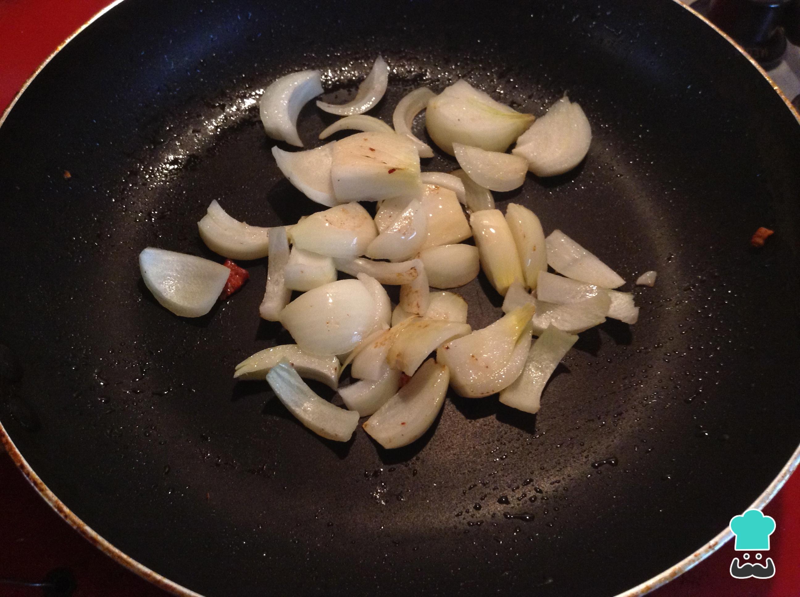 Para realizar la salsa de nuestro lomo con champiñones, lleva una sartén a fuego medio y agrega un poco de aceite de oliva o girasol, cuando este caliente agrega la cebolla en cascos y deja sofreír con sal y pimienta al gusto. Cuando observes que la cebolla toma un color transparente adiciona los champiñones y un poco de pasta de ajo al gusto.