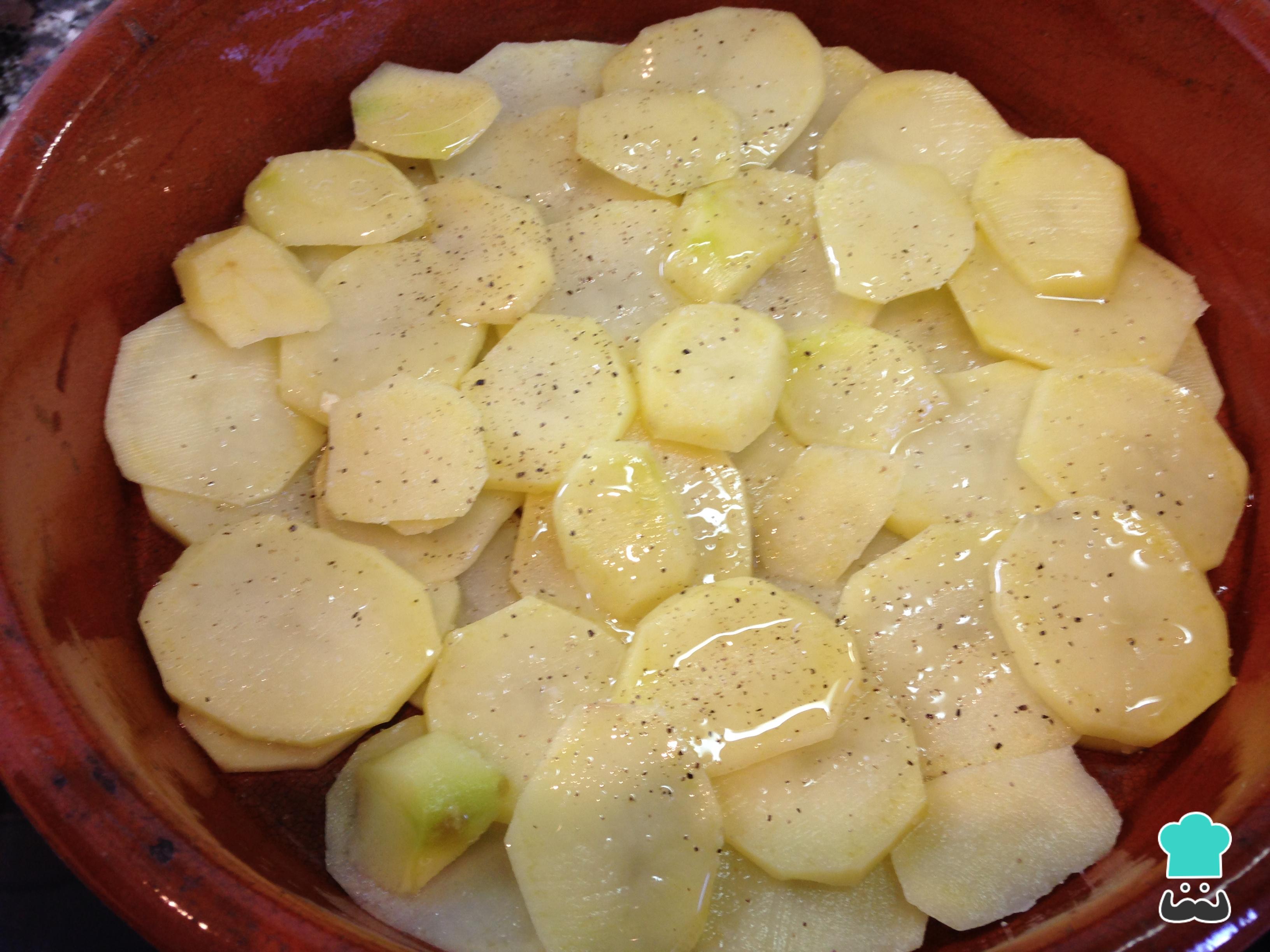 Empezaremos por preparar las patatas panaderas. Para ello, lavamos y pelamos las patatas y las cortamos en rodajas finas. Engrasamos con un poco de aceite una cacerola apta para horno y disponemos en ella la patata, que a continuación salpimentaremos y regaremos con un poco de aceite de oliva.