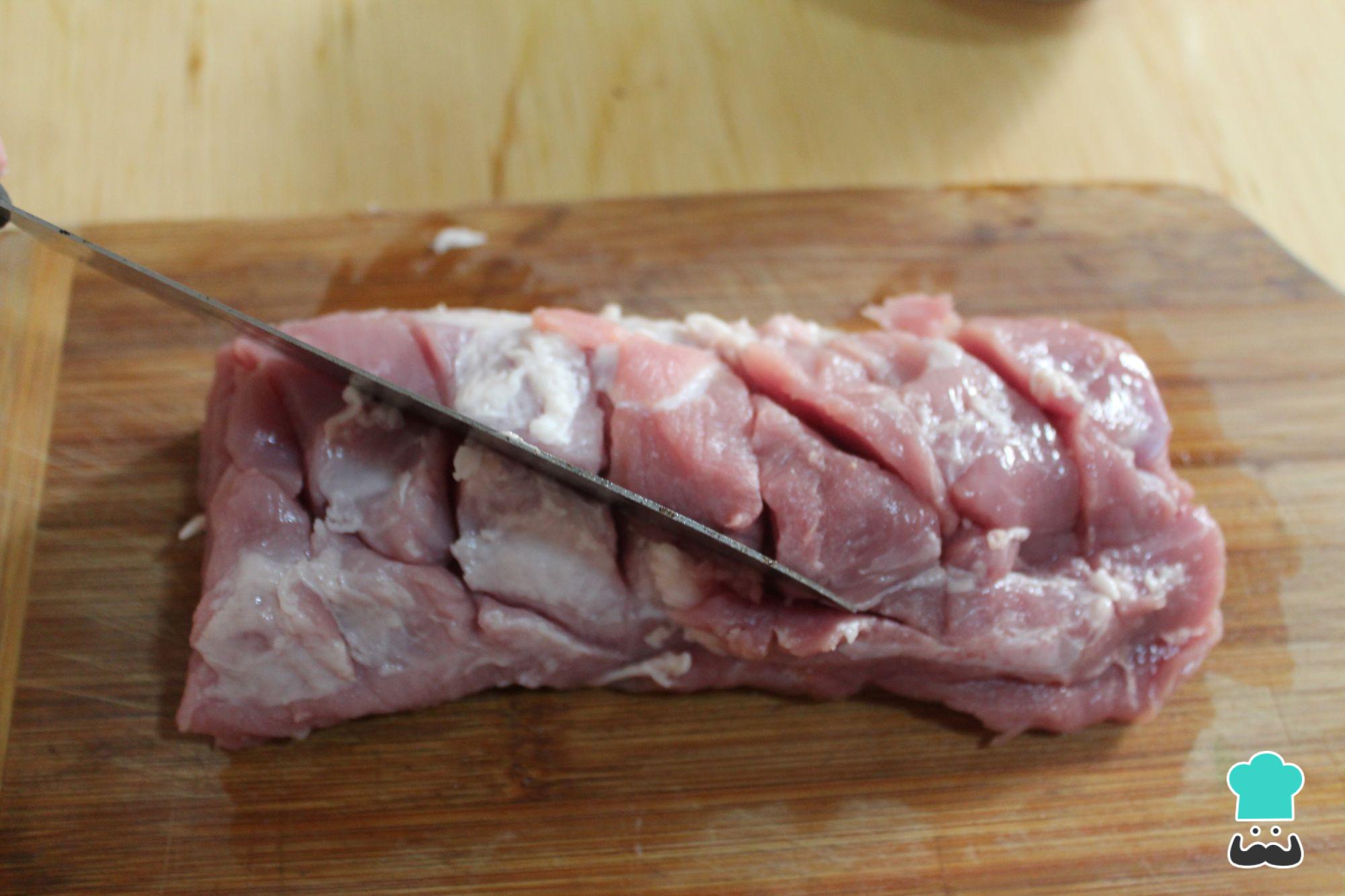 Prepara el solomillo. Retira del solomillo las posibles hebras de grasa con un cuchillo o con unas tijeras. A continuación, con un cuchillo afilado haz unos cortes transversales en la superficie del solomillo, como si de una rejilla se tratase. Reserva.