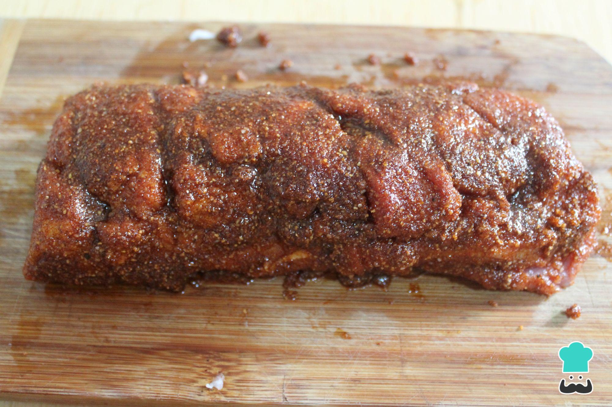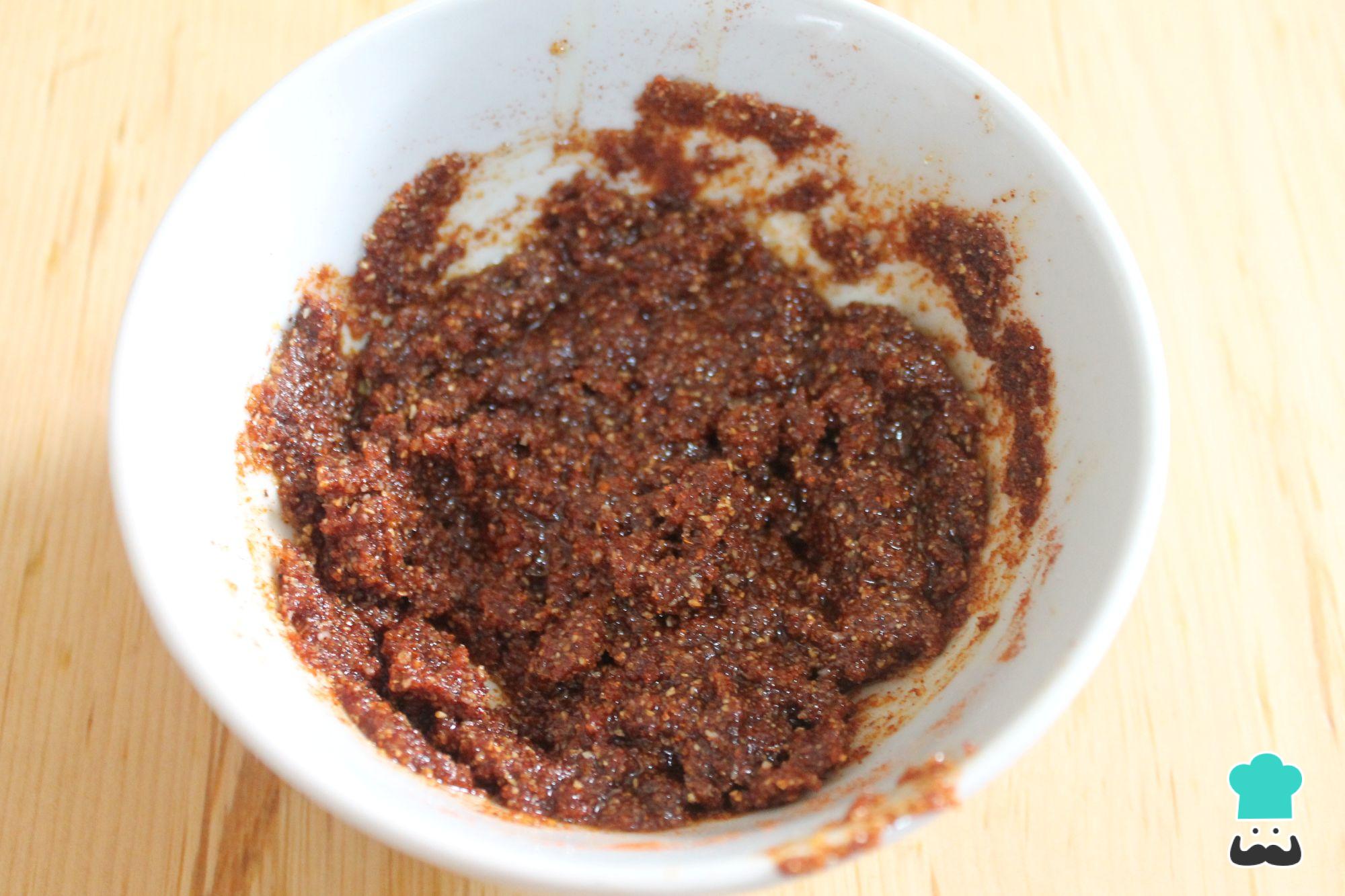 En un bol pequeño, añade el azúcar, el pimentón, el ajo en polvo y la pimienta negra recién molida. Pon también un poquito de sal, pero poca cantidad o te quedará salado, pues las especias ya aportan sabor suficiente. Añade el aceite de oliva y mezcla hasta conseguir una pasta.