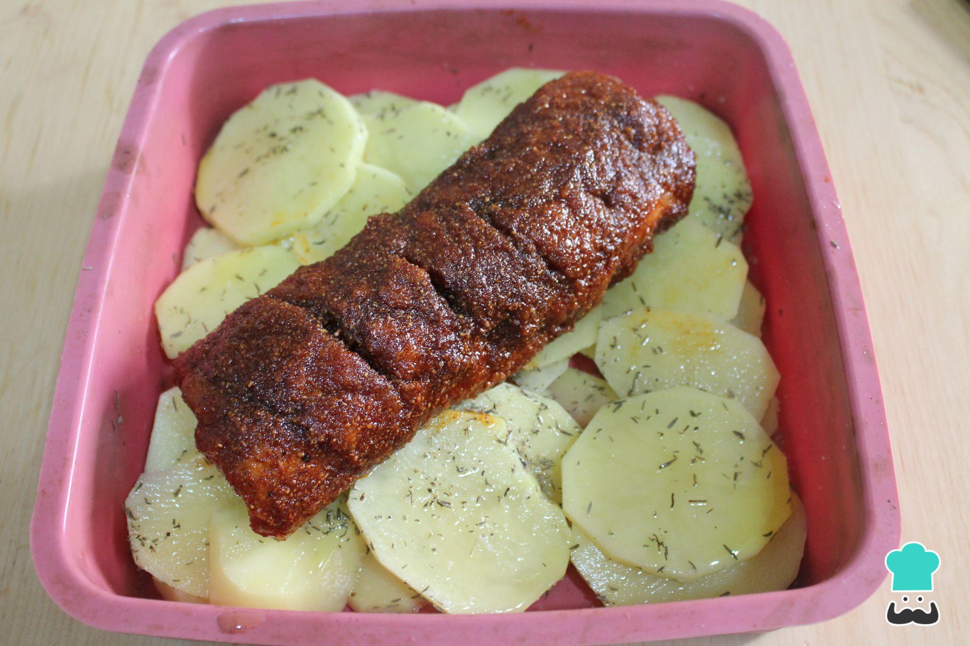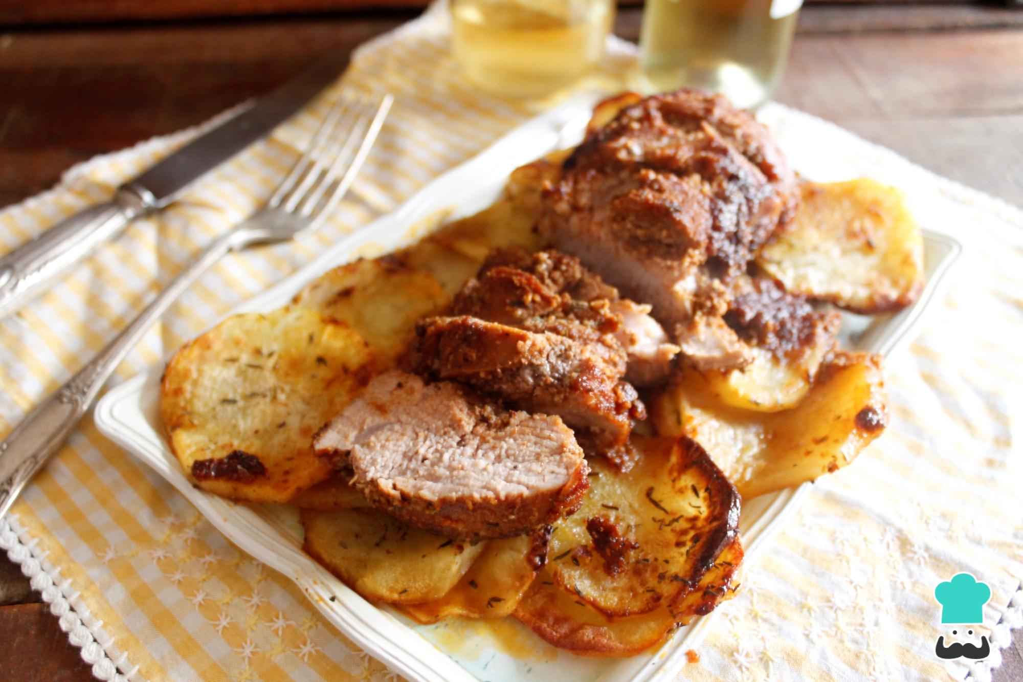 Por último, coloca el solomillo de cerdo encima de las patatas.