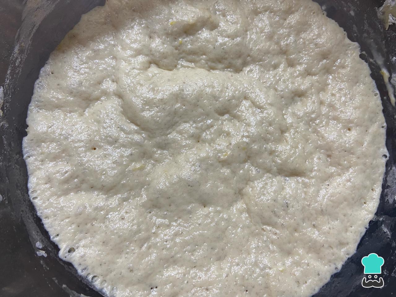 Diluye la levadura con la leche tibia y añade el azúcar y 1 cucharada de harina. Cubre y deja reposar hasta que se forme una esponja.
