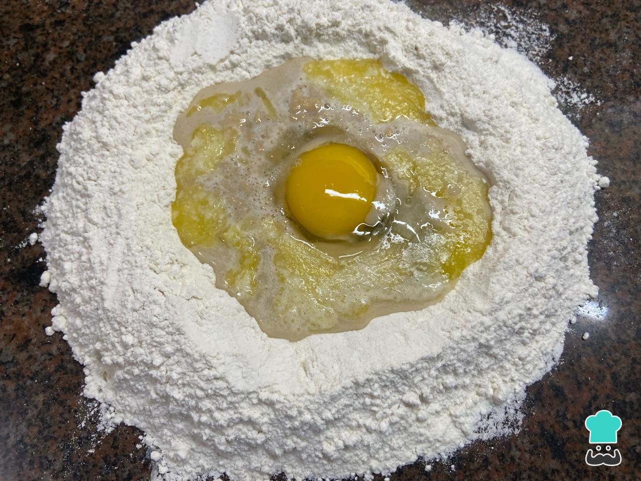 Realiza una corona con la harina sobre la mesada. En el centro haz un hueco para colocar el huevo, la manteca derretida y la esponja de levadura. Une los ingredientes hasta formar una masa y amasa entre 5 y 8 minutos. Deja reposar el bollo 15 minutos.