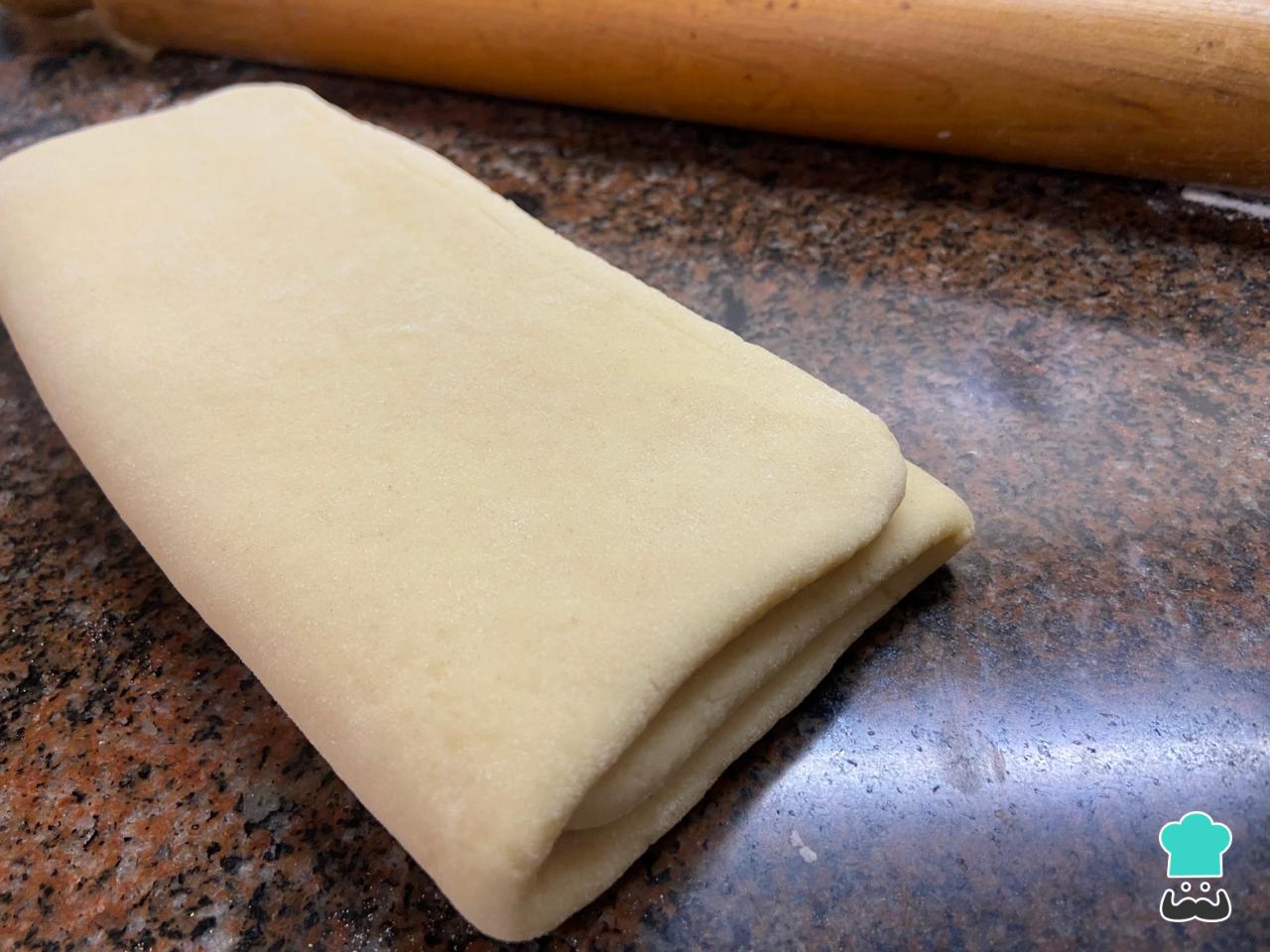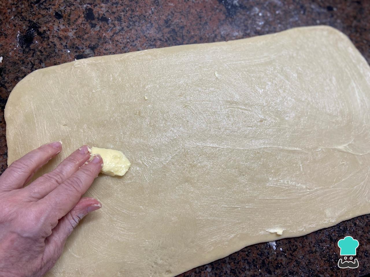 Con la ayuda del palote estira la masa de forma rectangular y de 3 mm de espesor, distribuye sobre la superficie la manteca pomada.