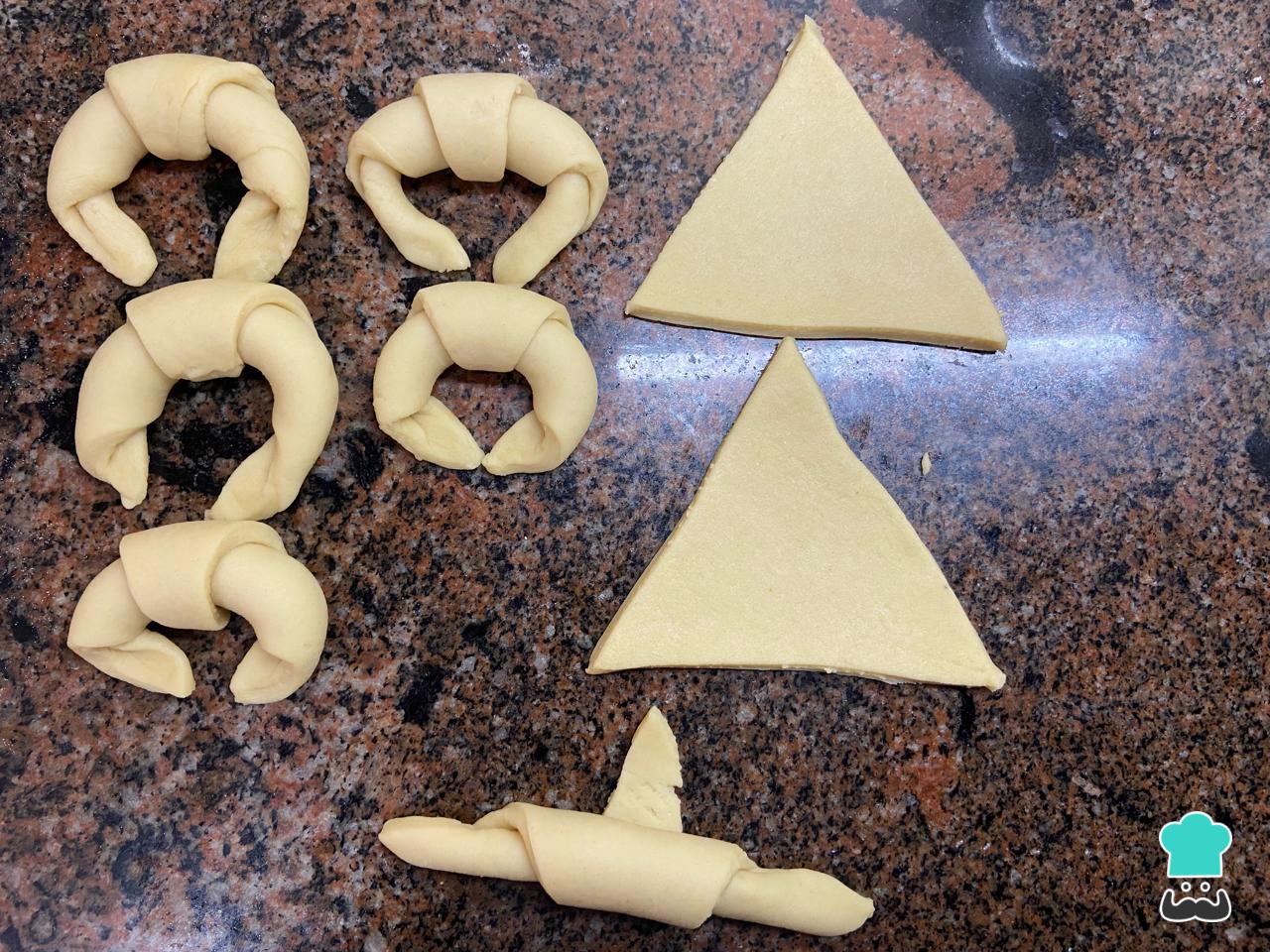 Retira la masa de la heladera y estírala de 3mm de espesor. Recorta los bordes para que quede un rectángulo prolijo. A continuación, divide el rectángulo en 2 partes y corta los triángulos para armar las medialunas caseras. Enciende el horno para precalentar a 200 °C y enmanteca una placa o asadera. Enrolla los triángulos desde la base hacia el vértice y arquea formando la medialuna y distribúyelas sobre la fuente de horno. Cubre y deja leudar por 30 minutos.