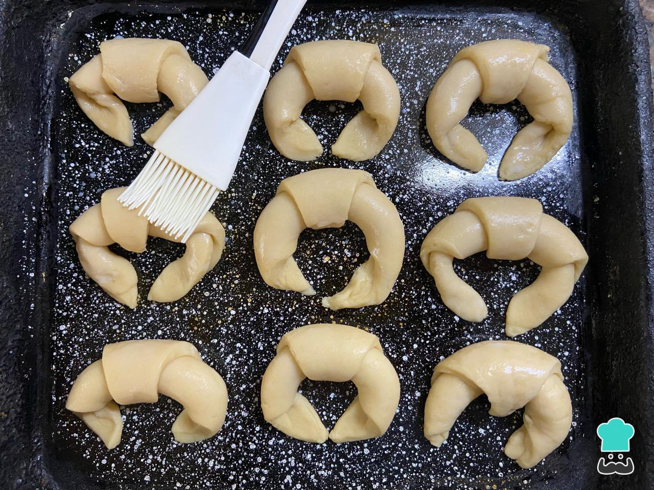 Cuando haya pasado el tiempo de levado de las medialunas fáciles, pinta con huevo batido y cocina en horno precalentado a 200 °C hasta que estén doradas (aproximadamente 15 minutos.)