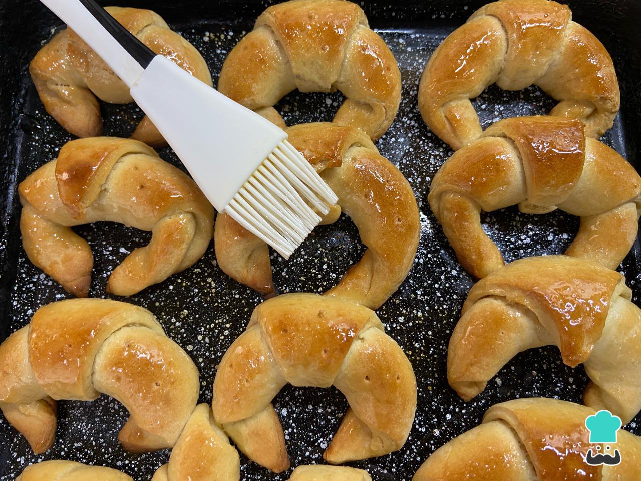 Retira del horno y, mientras estén calientes, pincela las medialunas de manteca con un almíbar preparado con partes iguales de agua y azúcar. Deja enfriar, realiza un corte por el centro de cada medialuna y rellena con jamón y queso. Ahora puedes comerlas así o llevarlas nuevamente al horno para comerlas tibias y con el queso derretido.