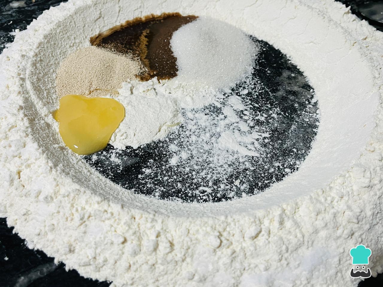 Mezcla las harinas y disponlas en una mesada limpia. Haz un hueco en el centro para agregar allí la levadura, el azúcar, la miel, la esencia de vainilla y la leche tibia.