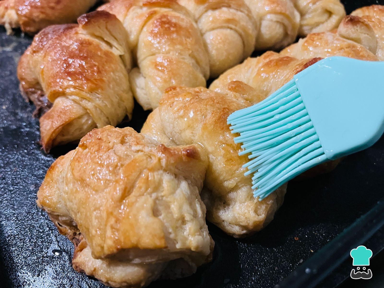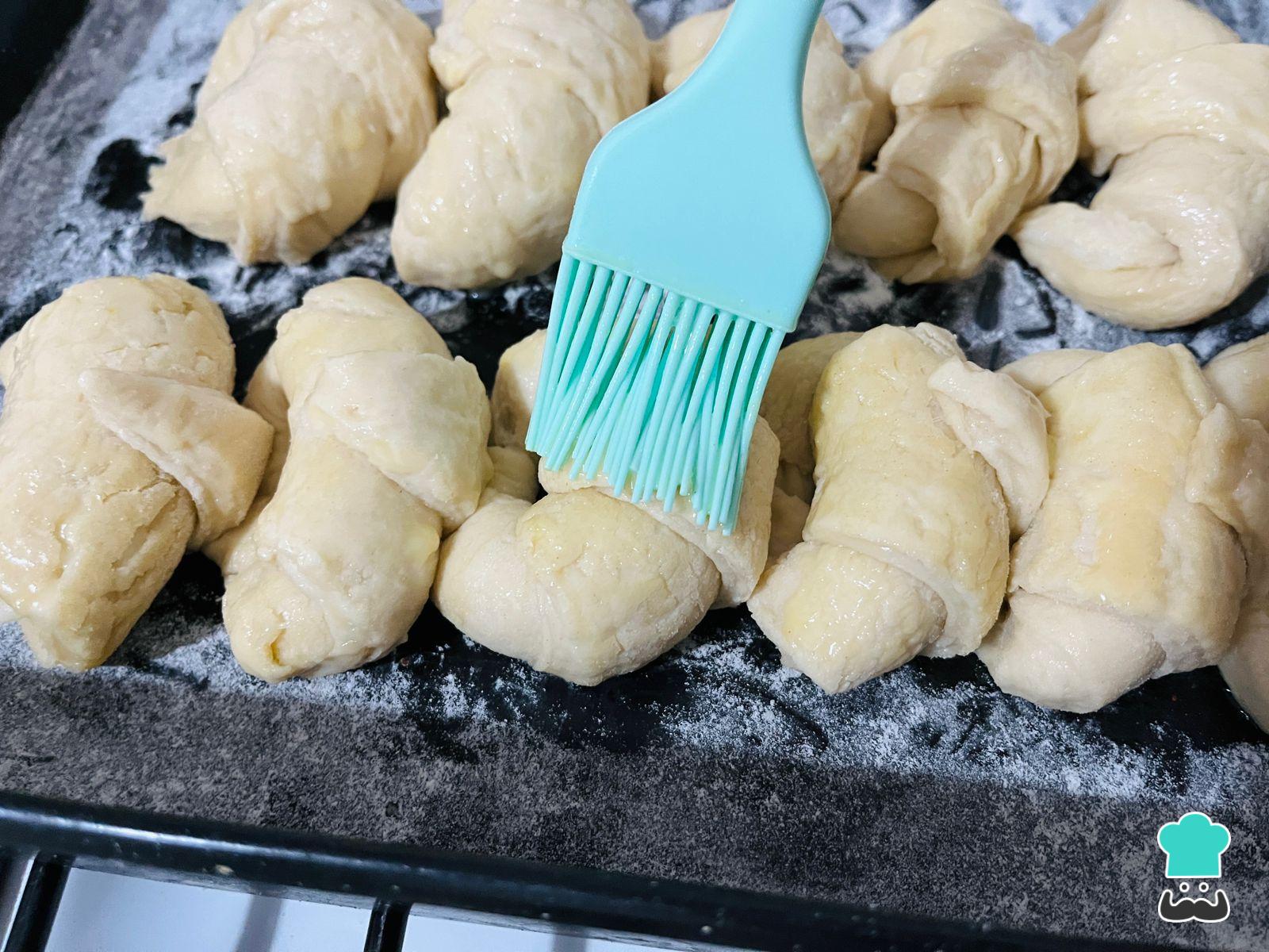 Dispón las medialunas hojaldradas en una asadera enharinada. Al acomodarlas, une las puntas para darles la forma y asegúrate de superponerlas con la medialuna siguiente para que no se quemen en el horno. Píntalas con la doradura y cúbrelas para dejarlas leudar a temperatura ambiente por 1 hora. Píntalas nuevamente y cocínalas en el horno pre calentado a 180 ºC por unos 25 minutos.