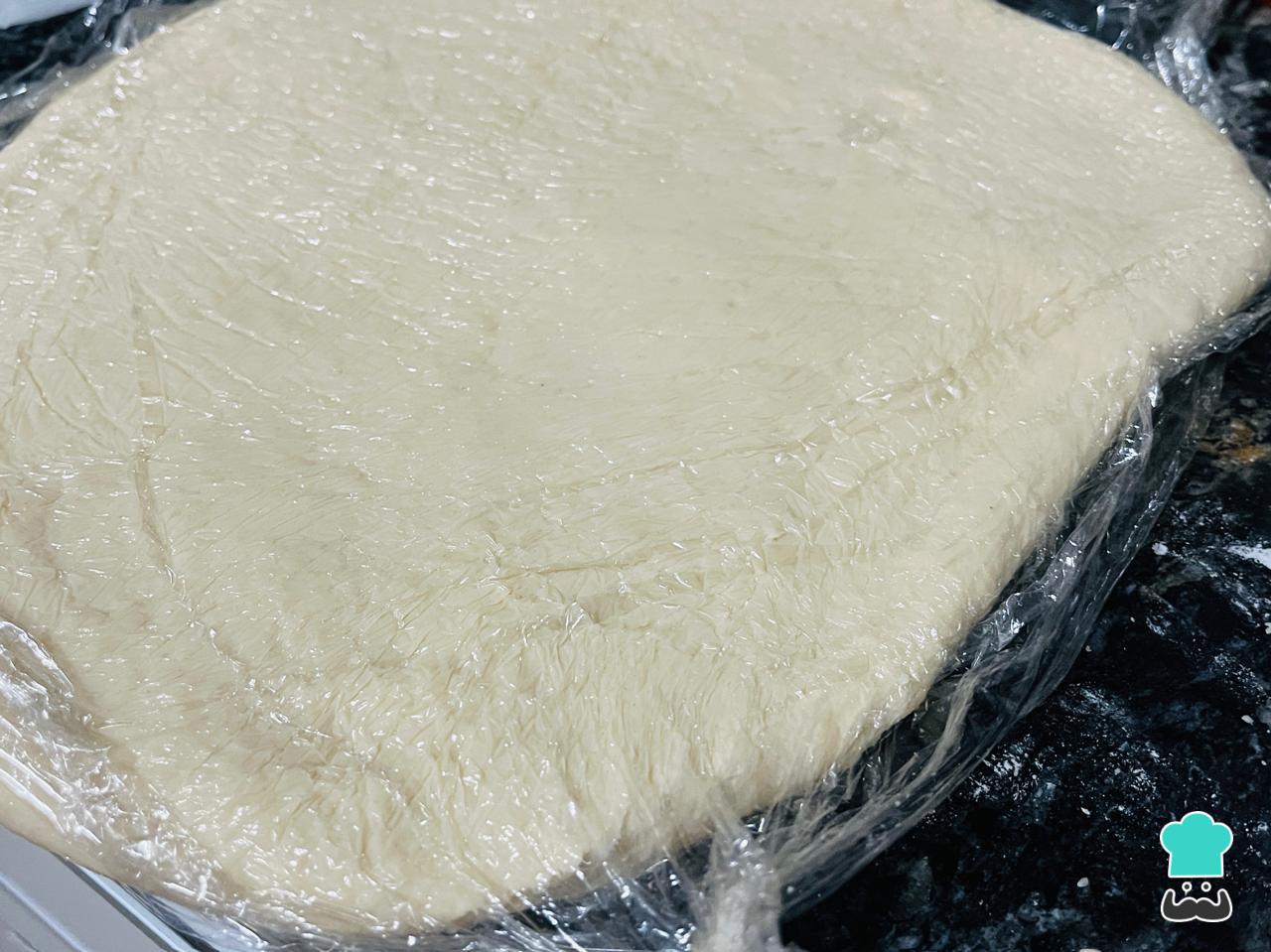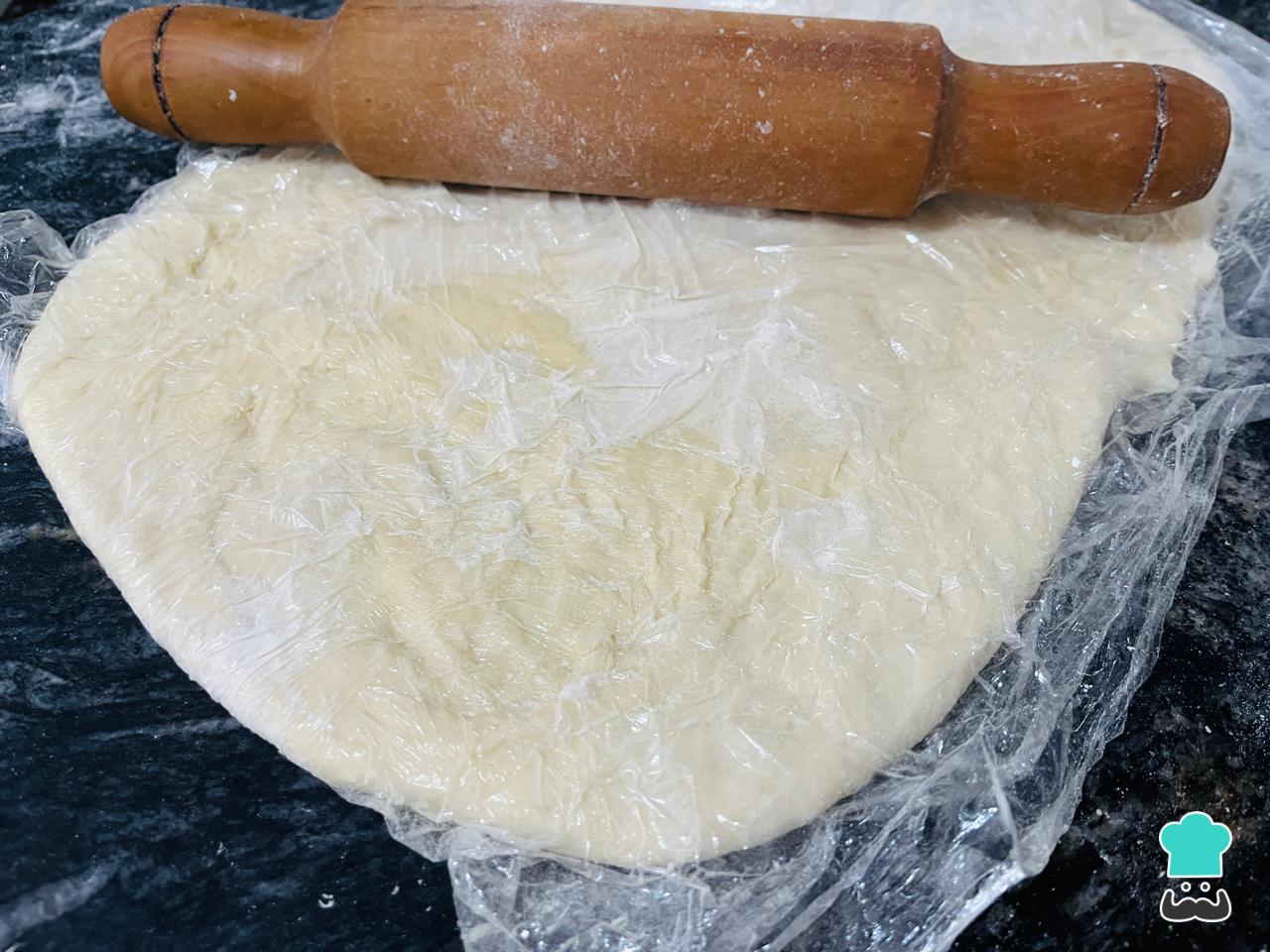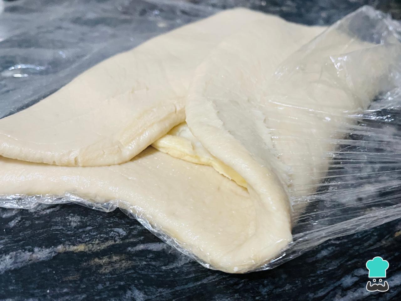 Estira la masa de forma rectangular y cúbrela con papel film. Disponla sobre una asadera, fuente o tabla que ayude a mantenerla recta. Llévala a la heladera por 2 horas o al congelador por 1 hora. También podrías dejarla de un día para el otro.