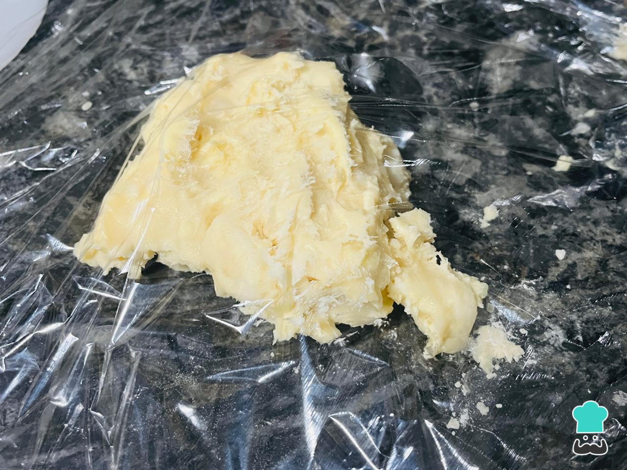 Disponlo a la mesada nuevamente con film y cúbrelo para poder estirarlo de forma cuadrada. Llévalo, al igual que la masa, a la heladera sobre algún elemento que lo mantenga recto.