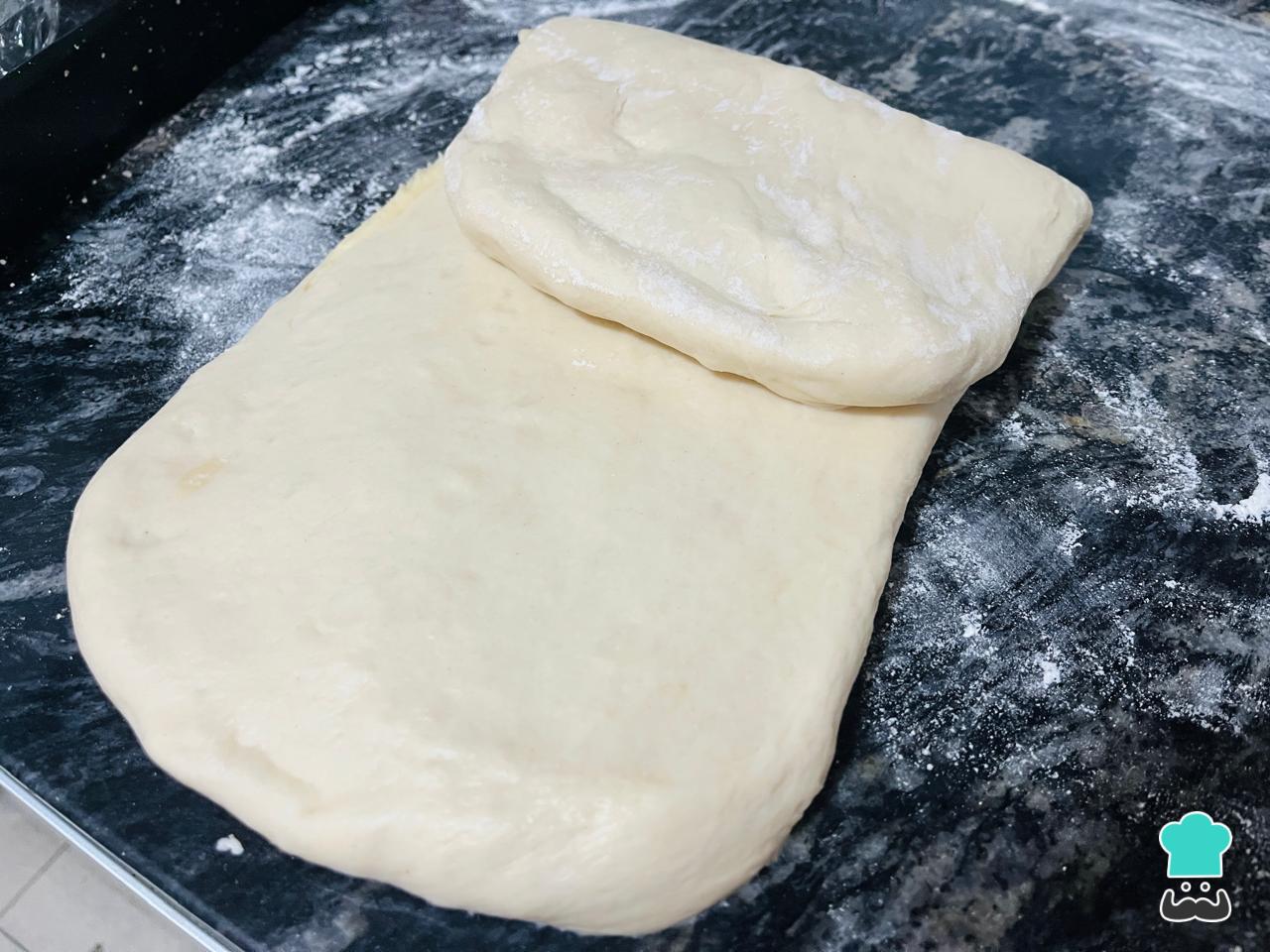Agrega el empaste en el centro del rectángulo de masa y cierra ambos lados hacia adentro para tapar la manteca. Asegúrate de cubrir bien todos los bordes para que quede "encerrada" y estira nuevamente de forma rectangular, dejando los bordes abiertos hacia arriba y abajo.