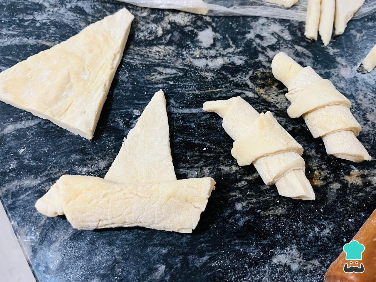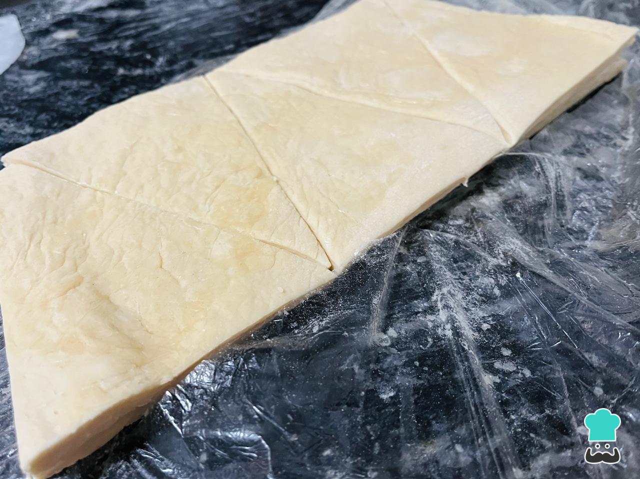 Al completar las vueltas de hojaldre, estira la masa de 1 centímetro de alto. Corta con una cuchilla sin serrucho los bordes para emparejarlos y, luego, el rectángulo al medio. Superpón ambas tiras como ves en la imagen y corta los triángulos para hacer las medialunas hojaldradas. Una base de 8 centímetros será suficiente.