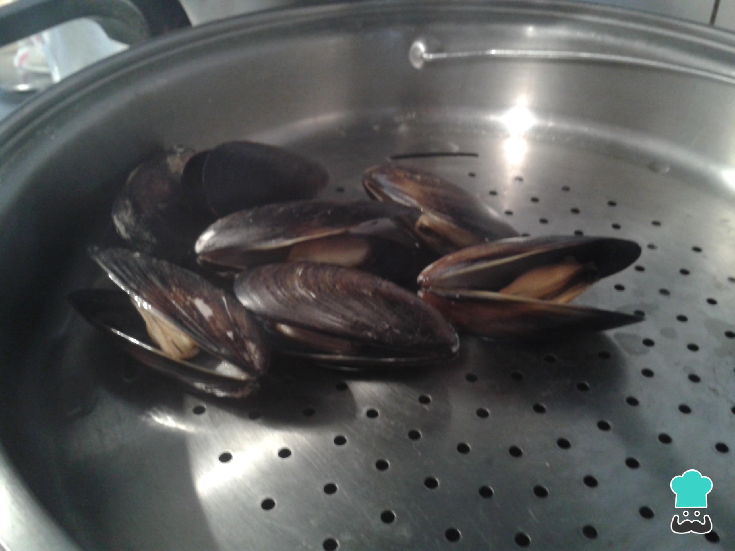 A continuación, los limpiamos bien y ponemos los mejillones en una vaporera. Hay que tener especial cuidado, ya que si estos no se abren durante la cocción hay que desecharlos porque significa que no estaban buenos.