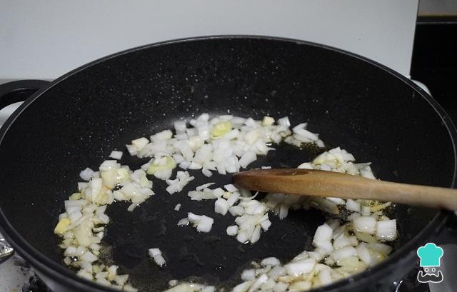Por otro lado, picamos los ajos y la cebolla y los pondremos a pochar en una sartén caliente con un chorro de aceite.