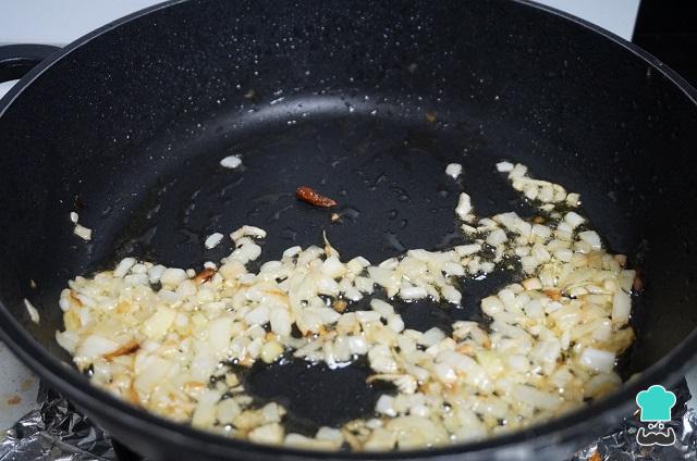 Pondremos en la sartén junto a la cebolla y el ajo las guindillas o cayenas. Las podemos poner partidas que picarán más, o enteras para que piquen menos.