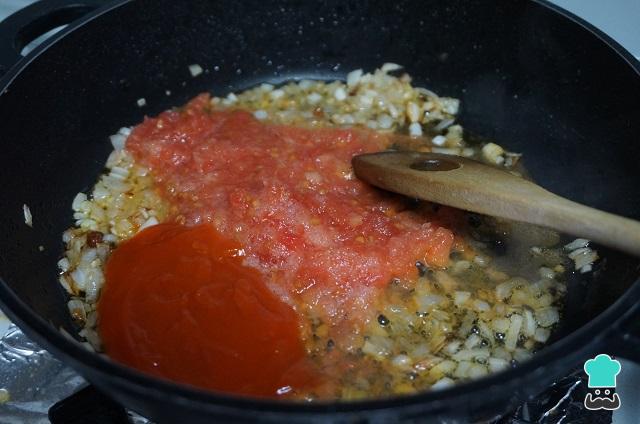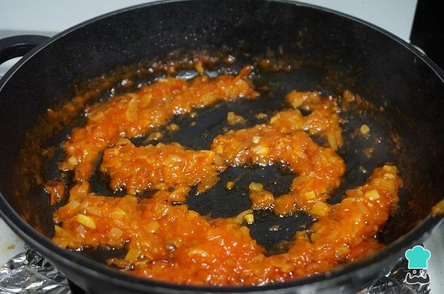 Mientras tanto, rallamos los tomates maduros y junto con el tomate frito lo echamos a la sartén removiendo todo el sofrito de los mejillones en salsa bien.