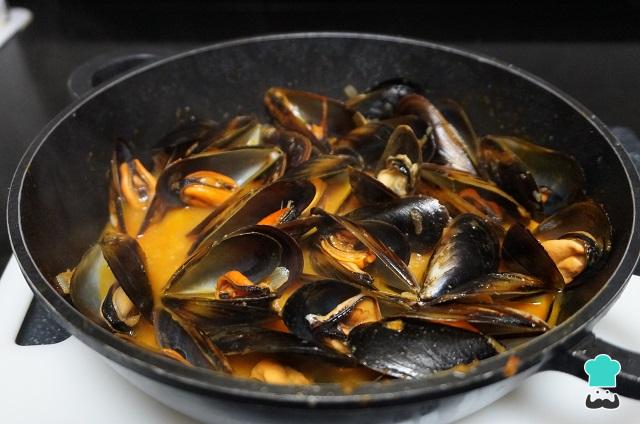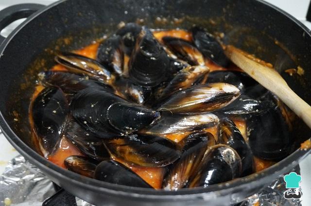 Una vez está lista la salsa de tomate picante pondremos los mejillones en la sartén y los dejaremos hasta que se vayan abriendo.