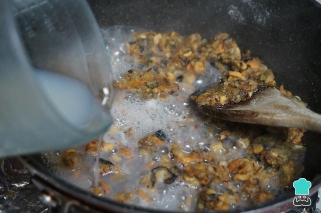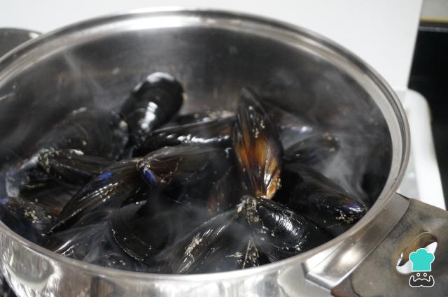 Limpia los mejillones, quita los pelillos y rasca bien la concha para que quede bien limpia. Pon una olla al fuego con los mejillones, tápala y deja que se cocinen hasta que estén abiertos. En este momento, apaga el fuego y deja que se enfríen. Reserva el agua que han soltado para usarla más adelante.