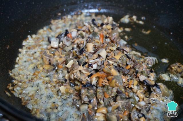 Pica en trozos muy pequeños los mejillones. Pela y pica también muy pequeña la cebolla. Pon una sartén al fuego con la mantequilla y un chorrito de aceite, añade la cebolla y deja que se poche hasta que quede transparente y coja un poco de color, entonces agrega los mejillones picados.