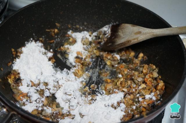 Remueve, incorpora la harina y sigue moviendo para que se cocine y coja un poco de color. Mezcla durante un par de minutos. Este paso es importante para que la harina no quede cruda y, por tanto, la masa de los mejillones tigres tenga buen sabor.