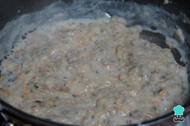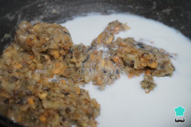 Ve añadiendo la leche que previamente habrás calentado en el microondas. Hazlo poco a poco y dando vueltas hasta formar una masa cremosa. La cantidad de leche puede variar según lo que admita el sofrito.