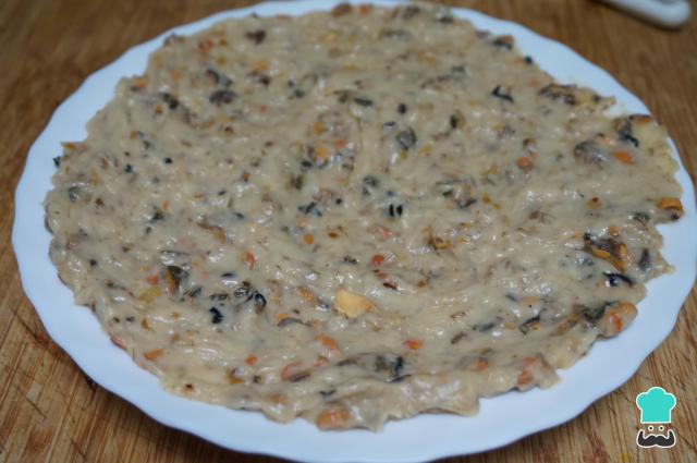 Pon la masa en una fuente, deja que se enfríe y métela en la nevera un par de horas para que se asiente y quede bien para rellenar los mejillones tigres.