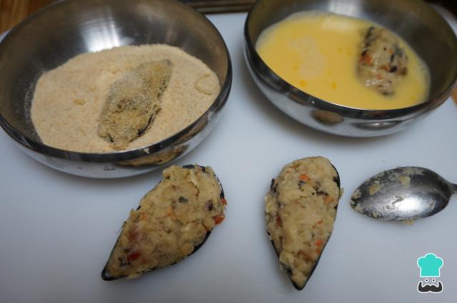 Rellena los mejillones. Para ello, pon en cada concha una cucharada de masa bien llena y repite el proceso con todas las conchas. En un bol pon el pan rallado y en otro bate un par de huevos. Pasa los mejillones tigre primero por el huevo y luego por el pan rallado, así quedarán bien rebozados.