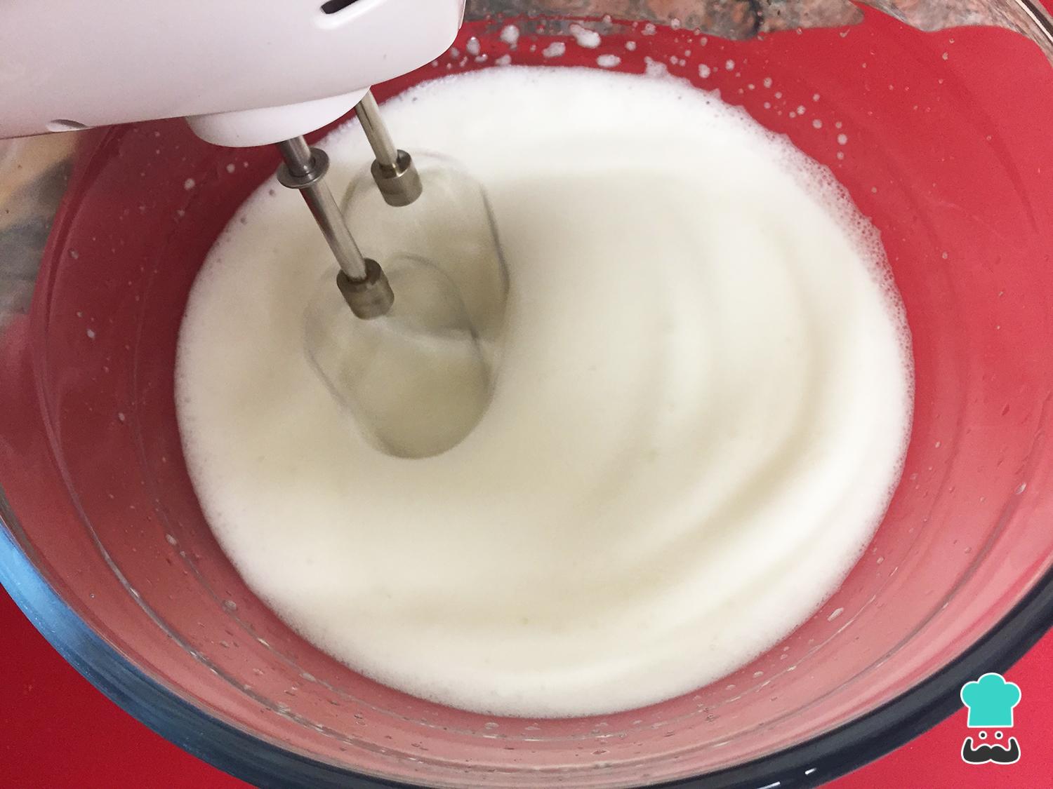 Luego, batimos el agua de garbanzos con unas varillas eléctricas a velocidad media-alta hasta obtener el punto de nieve, como si de claras de huevo se tratara.