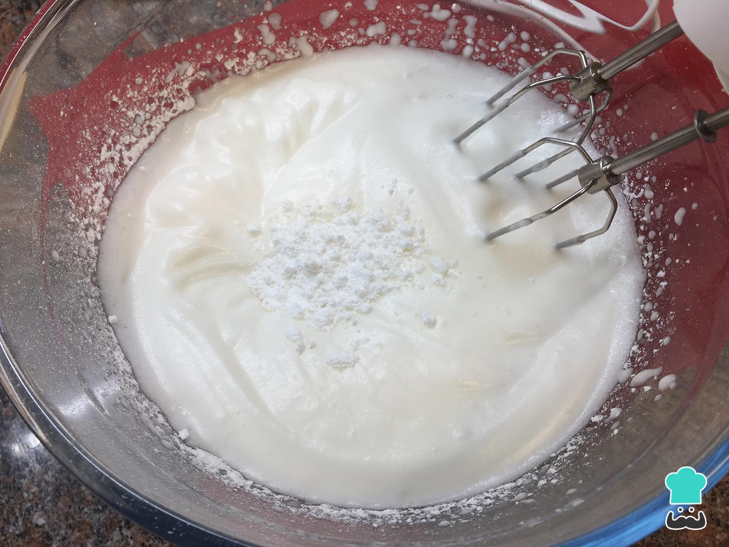 Una vez integrado el ingrediente anterior, podemos proceder a añadir el azúcar pulverizado poco a poco y sin dejar de batir. Puedes comprar este tipo de azúcar ya confeccionado o elaborarlo tú mismo siguiendo nuestra sencilla receta de azúcar glass.