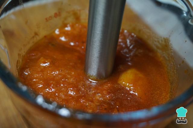 Cuando esté listo el sofrito, pasa todo a un vaso batidor y tritura hasta que quede una crema fina y, si se queda muy espesa la salsa, se puede añadir un poco de agua o caldo. Vuelve a añadir la salsa a la cazuela con el fuego suave, prueba de sal y rectifica.