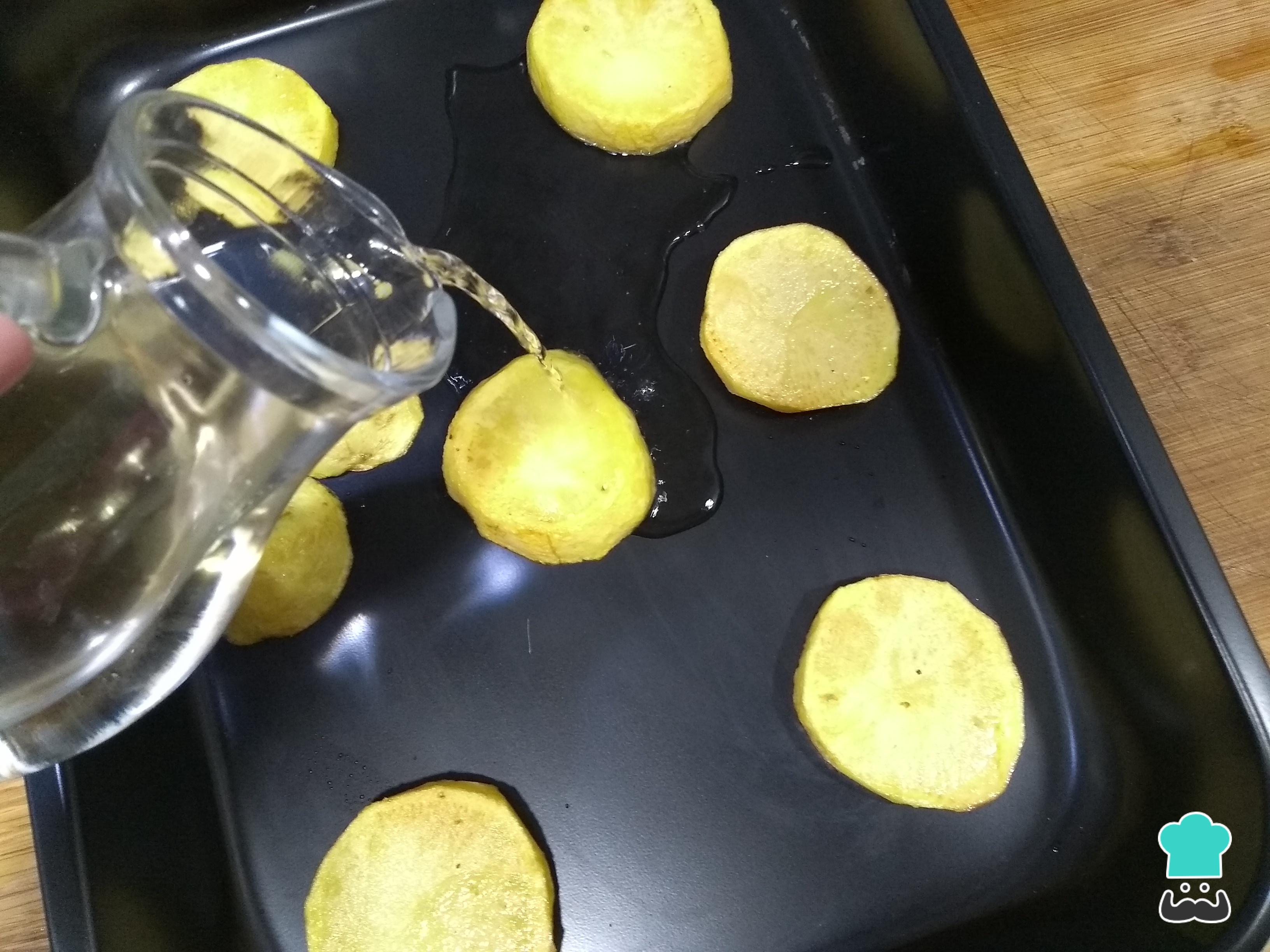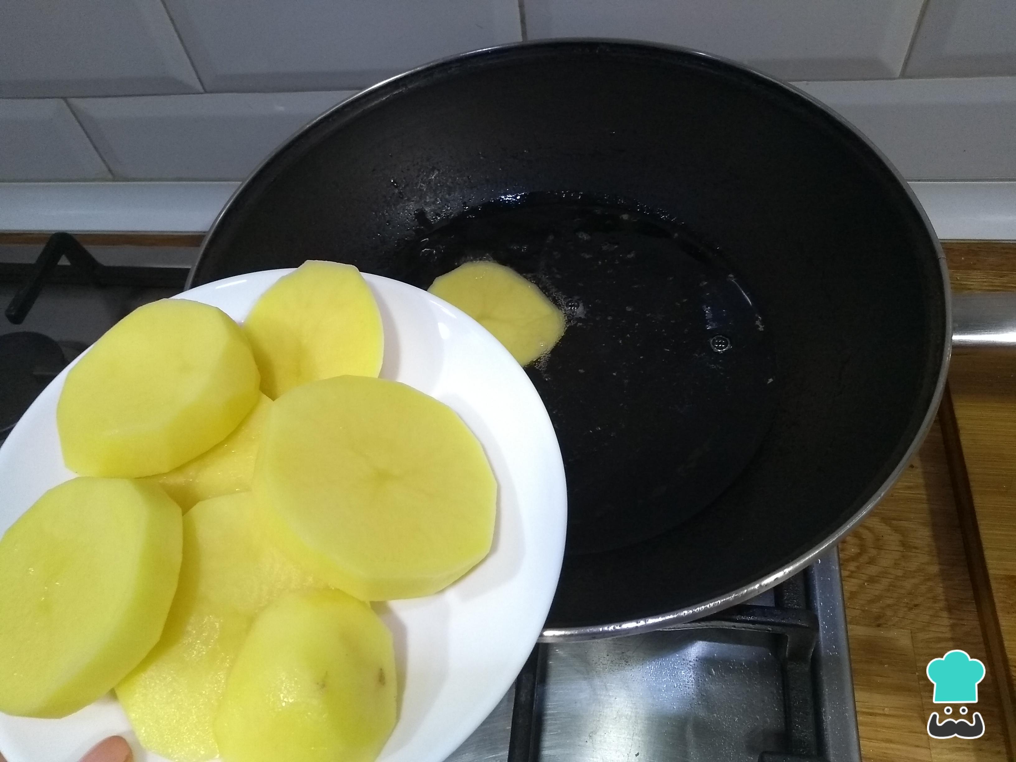 Pela y corta las patatas en rodajas bastante gruesas, pon aceite a calentar y fríelas, pero solo dorándolas por fuera para que después acaben de hacerse en el horno. Mantén el fuego alto para conseguir esto, sácalas y déjalas en un plato con papel de cocina.