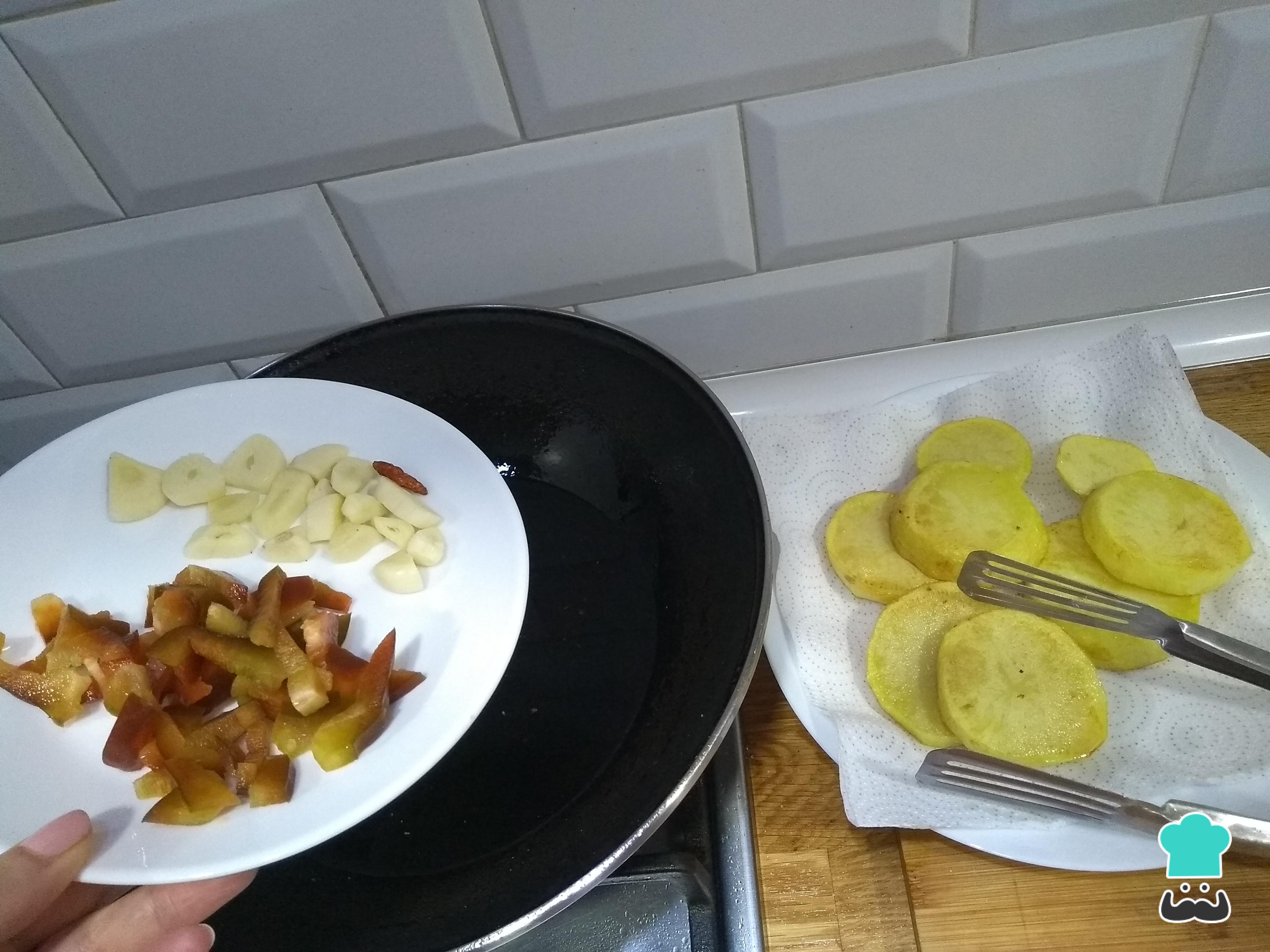 Corta el pimiento en tiras finas y los dientes de ajo en rodajas, agrégalos a la sartén con una cayena si quieres que tu receta de merluza al orio tenga un toque picante. Rehoga durante 3 minutos, removiendo para que se doren por todos lados y retira.